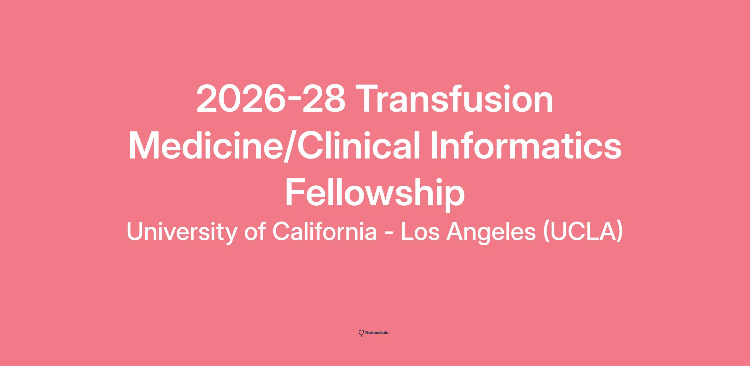 Please see our website for detailed information on the Transfusion Medicine/Clinical Informatics fellowship: https://www.uclahealth.org/departments/pathology/education/fellowship-programs/combined-pathologyclinical-informatics-fellowship/transfusion-medicineclinical-informatics-fellowship