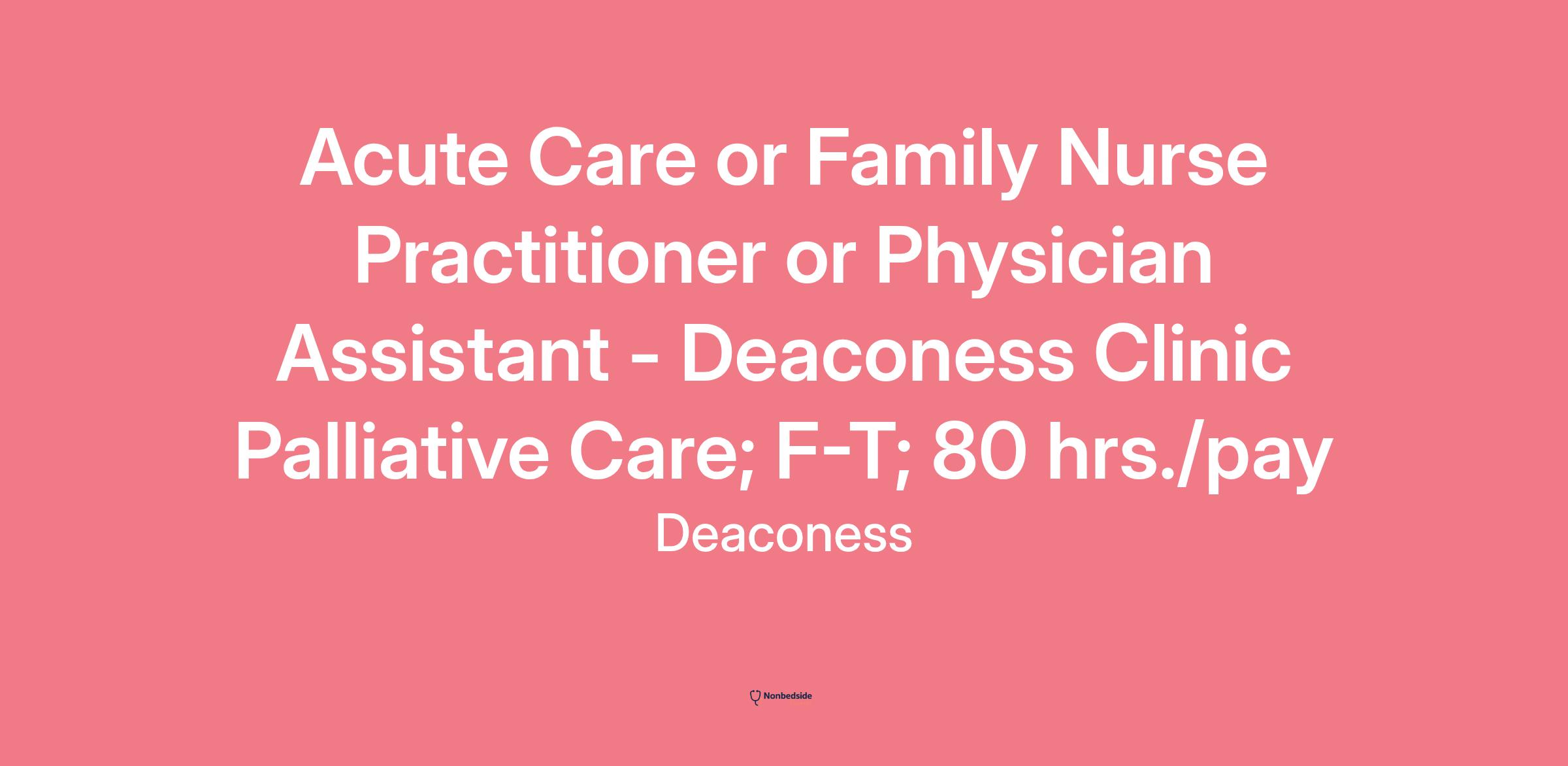 This is a full-time position working 80 hours every 2 weeks. Palliative Care completes consults in the inpatient and outpatient setting. This position will be focused on in-home and outpatient care.