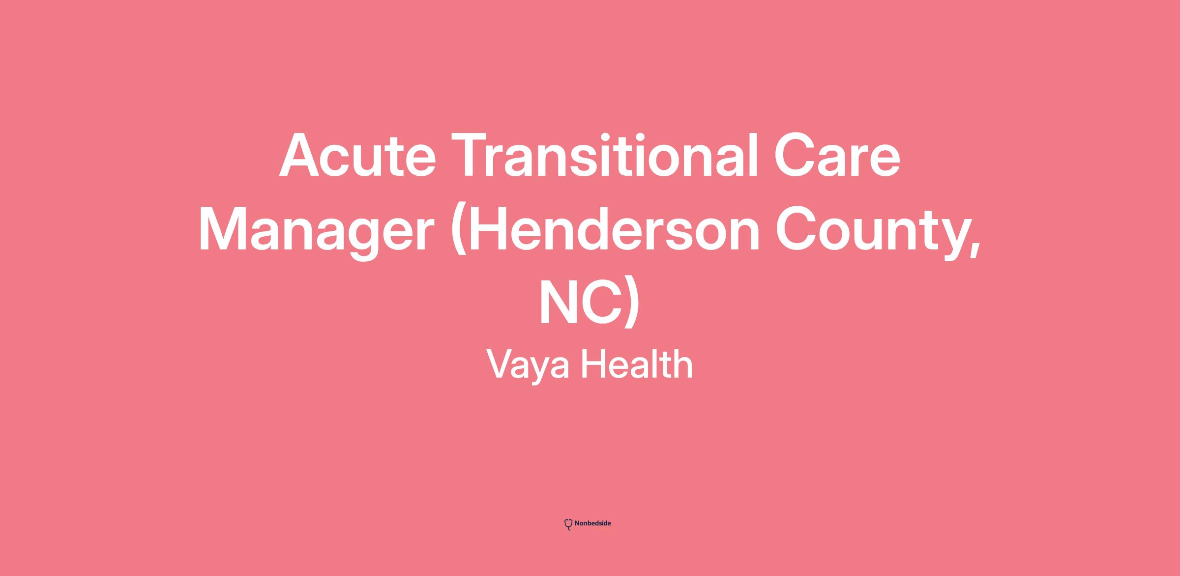 The Acute Transitional Care Manager (ATCM) is responsible for proactive intervention and coordination of care to members and recipients of Vaya's Health plan who are receiving care in an inpatient community hospital or Emergency Department in some instances who require complex care planning to alleviate inappropriate levels of care or care gaps through multidisciplinary team care planning, linkage and/or coordination of services across the MH/SU/IDD and other healthcare network(s) with existing or new care team members within the Acute Transitional CM professional scope. The ATCM is responsible for knowing and implementing organizational policies, Division and departmental specific guidelines.