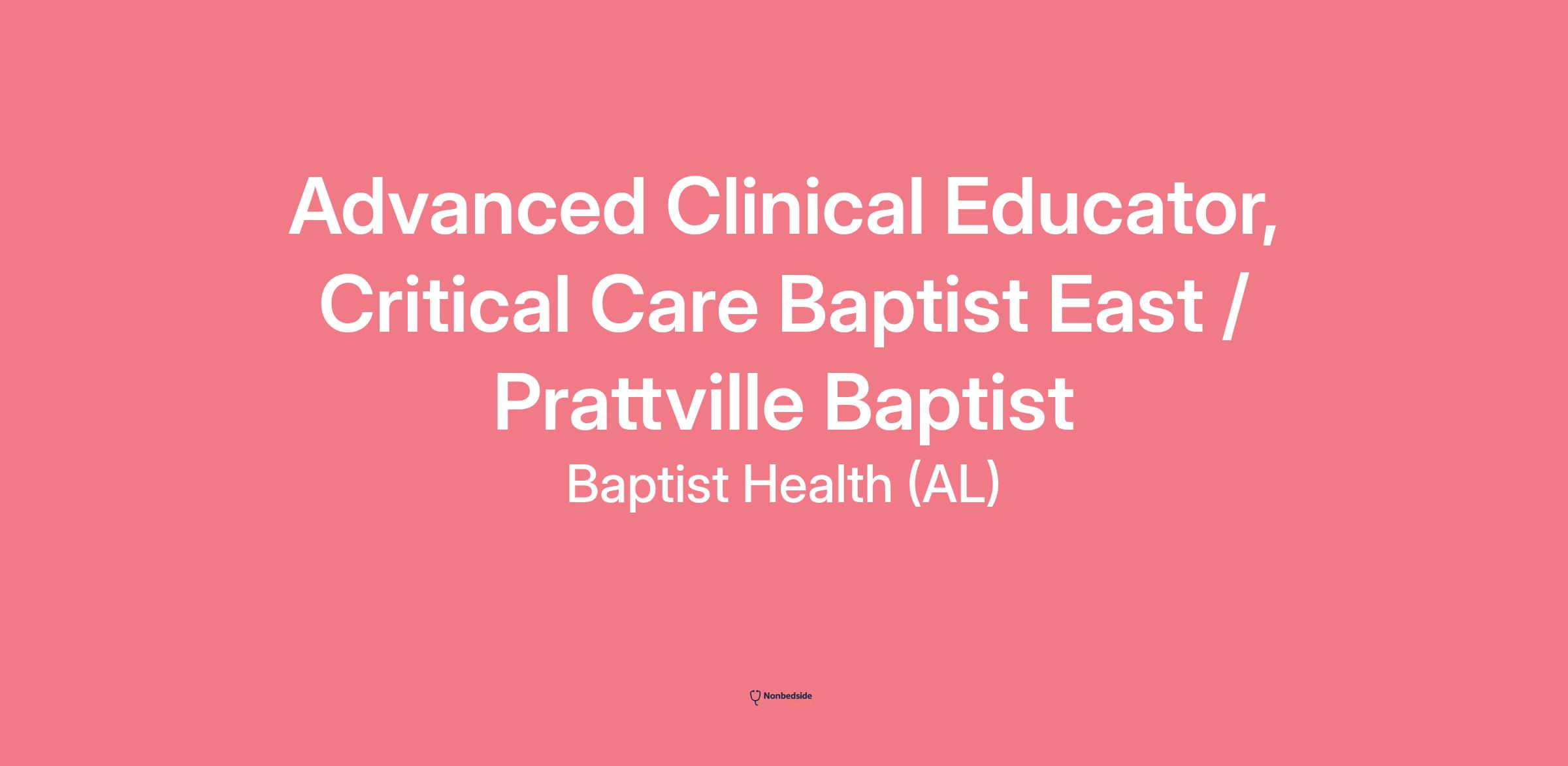 Overview The RN - Advanced Clinical Educator has demonstrated a commitment to higher Education and is responsible for developing staff throughout Baptist Health by providing expertise as an Educator, Consultant, Facilitator, Change Agent, Leader, and Researcher. The Educator shall be responsible to support the development of new and current staff, foster empowerment and the development of knowledge through the use of evidence-based practice, relationship based care, SMART principles, and principles of adult learning. This individual will utilize the Benner Model to move staff through the continum from novice to expert. This will occur by facilitating the educational process through assessment, development, planning, implementation, and evaluation of competency, continuing education and leadership development. In addition, the Educator will serve as a role model of professional behavior. This position may have additional duties assigned that are within scope of the role.