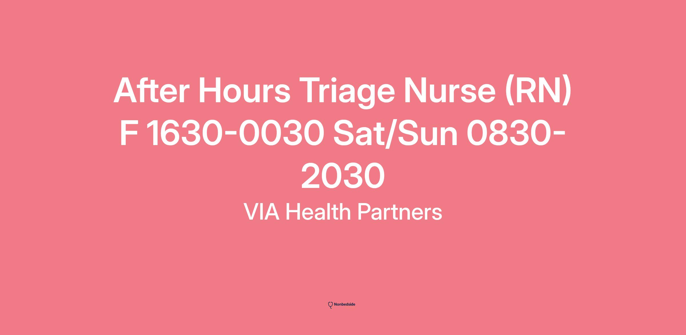 Join to apply for the After Hours Triage Nurse (RN) F 1630-0030 Sat/Sun 0830-2030 role at VIA Health Partners .