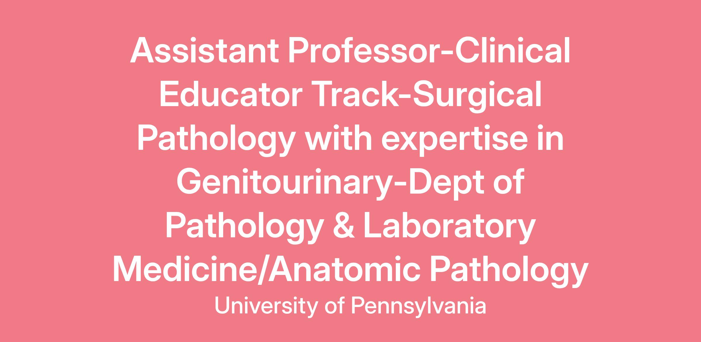The Department of Pathology and Laboratory Medicine at the Perelman School of Medicine at the University of Pennsylvania seeks candidates for an Assistant Professor position in the non-tenure clinician educator track. Expertise is required in the specific area of surgical pathology with interest in genitourinary pathology. Applicants must have an M.D. degree. American Board of Pathology, AP-only or AP/CP.