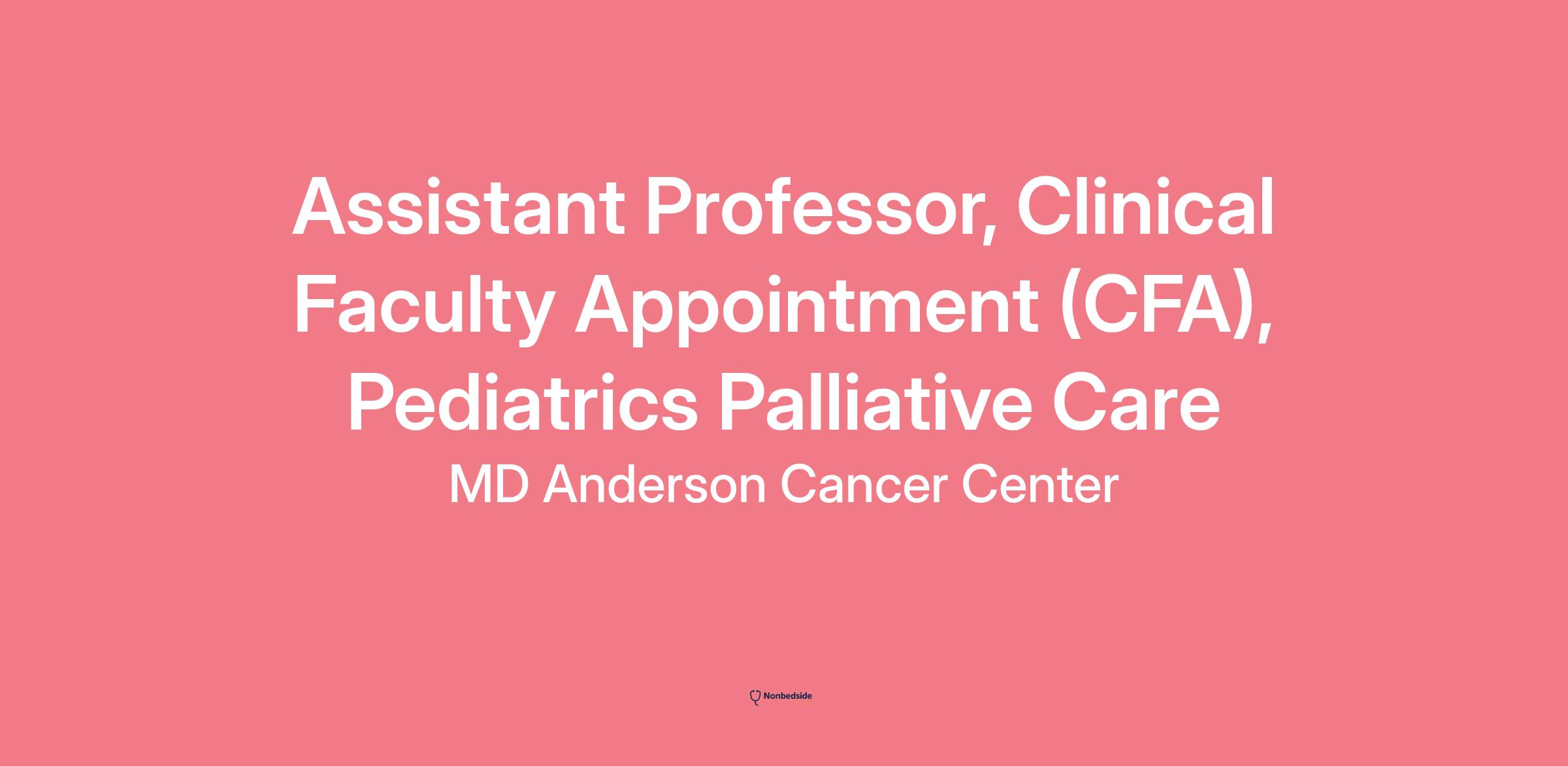 The Department of Pediatrics Patient Care at MD Anderson Cancer Center is seeking a full-time faculty position at the level of Assistant Professor, Clinical Faculty Appointment to join the Pediatric Palliative and Supportive Care Team. The clinical faculty position will provide robust, inter-disciplinary pediatric palliative care to infants, children, adolescents, and AYAs suffering from life-threatening, life-limiting, and terminal diseases.