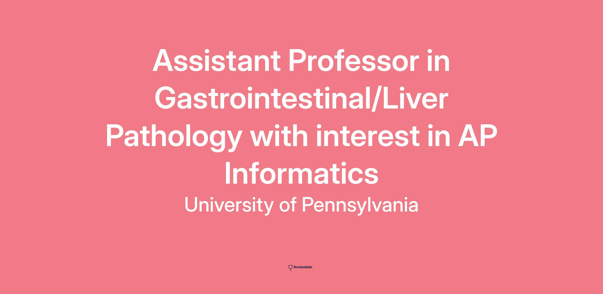 The Department of Pathology and Laboratory Medicine at the Perelman School of Medicine at the University of Pennsylvania seeks candidates for an Assistant Professor position in the non-tenure academic clinician track. Expertise is required in the specific area of gastrointestinal and liver pathology as well as AP informatics. Applicants must have an M.D. or M.D./Ph.D. or equivalent degree.