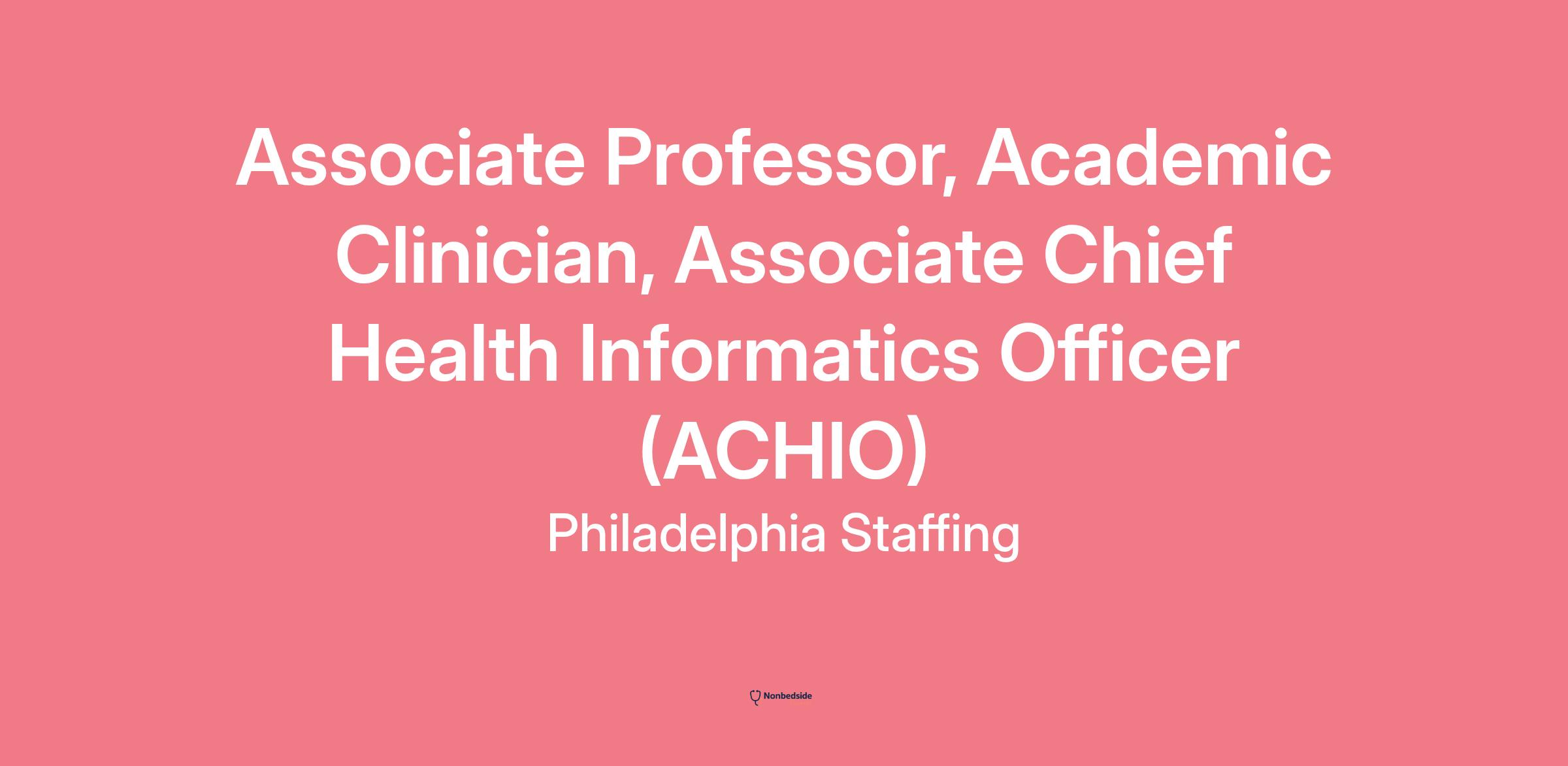 Children's Hospital of Philadelphia and the Department of Pediatrics at the Perelman School of Medicine at the University of Pennsylvania seek candidates for an associate professor position in the non-tenure academic clinician track. Expertise is required in the specific area of clinical informatics, with special weight given to applicants with advanced training (e.g. fellowship, master's degree, PhD, or other advanced certification) in this field. Consideration will also be given to applicants with advanced training in any related disciplines, such as human computer interaction, computer science, implementation science, user-centered design, biostatistics and epidemiology, or population health. Applicants must have an M.D. or equivalent degree. Board certification or eligibility in Clinical Informatics (ABPM) or an equivalent certification of competency in the field (AMIA AHIC certification) is required. Applicants with exceptional qualifications but who are not eligible for the ABPM board certification or AHIC will be considered. Certifications in relevant EHR technologies are strongly preferred, with preference given to applicants with active and relevant certifications in the Epic EHR. Teaching responsibilities may include the teaching of medical students, residents, and fellows, as well as formal lecture opportunities on the topic of clinical informatics and related topics. Clinical responsibilities may include outpatient clinical practice in a pediatric setting, preferably in a pediatric subspecialty.