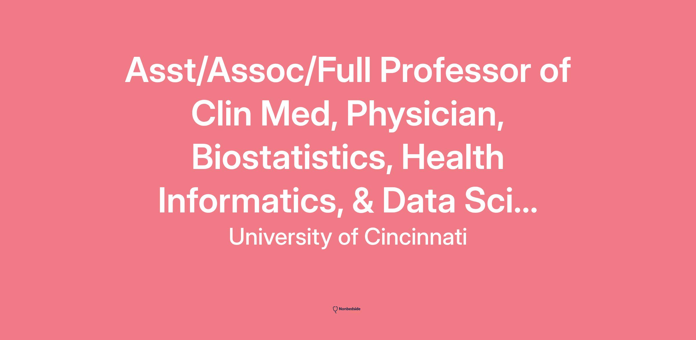 Job Overview As one of the oldest medical schools in the country, the University of Cincinnati College of Medicine (COM) has a reputation for training best-in-class healthcare professionals and developing cutting-edge procedures and research that improves the health and clinical care of patients. The fast-growing Department of Biostatistics, Health Informatics and Data Sciences is seeking a full-time physician, fellowship trained in Clinical Informatics, to improve system services, promote maximum efficiency of health information technologies and implement best practices to enhance the productivity of clinical systems. Collaborating with faculty across the health system, the successful candidate will apply their expertise to advance the departments’ strategy and research efforts through collaboration, leadership, and external funding. Rank is commensurate with experience.