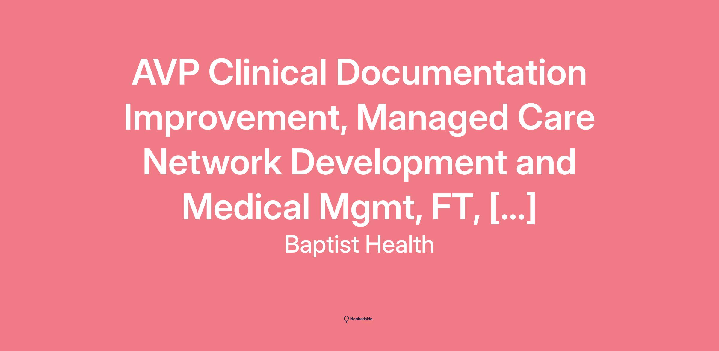 AVP Clinical Documentation Improvement, Medical Management and Managed Care, FT, 8:30A-5P Join to apply for the AVP Clinical Documentation Improvement, Medical Management and Managed Care, FT, 8:30A-5P role at Baptist Health
