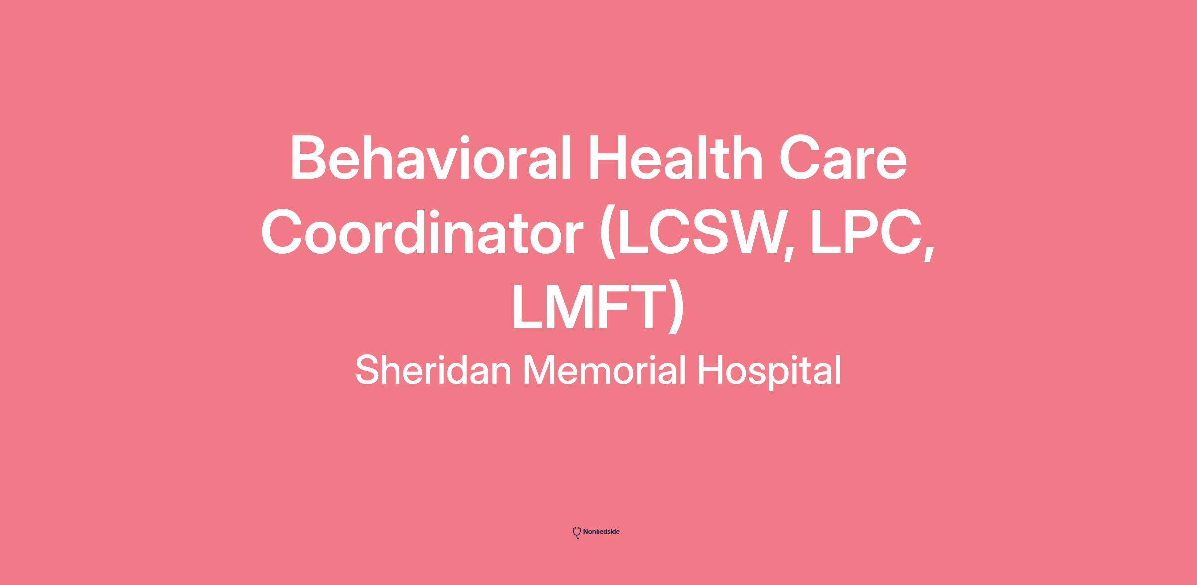 Behavioral Health Care Coordinator (LCSW, LPC, LMFT) ABOUT SHERIDAN MEMORIAL HOSPITAL At Sheridan Memorial Hospital, we proudly rank in the top 13.6% of U.S. hospitals, recognized by the Centers for Medicare and Medicaid Services. With over 850 dedicated employees and 100+ expert providers across 25 specialties, we are committed to exceptional, patient-centered care. Set in northern Wyoming’s stunning Big Horn Mountain foothills, Sheridan offers outdoor adventure and community charm. Our hospital combines cutting-edge technology with a collaborative, innovative culture. Join a team that values your skills, fosters growth, and empowers you to impact lives meaningfully. Apply today and be part of Sheridan Memorial Hospital’s mission of excellence!