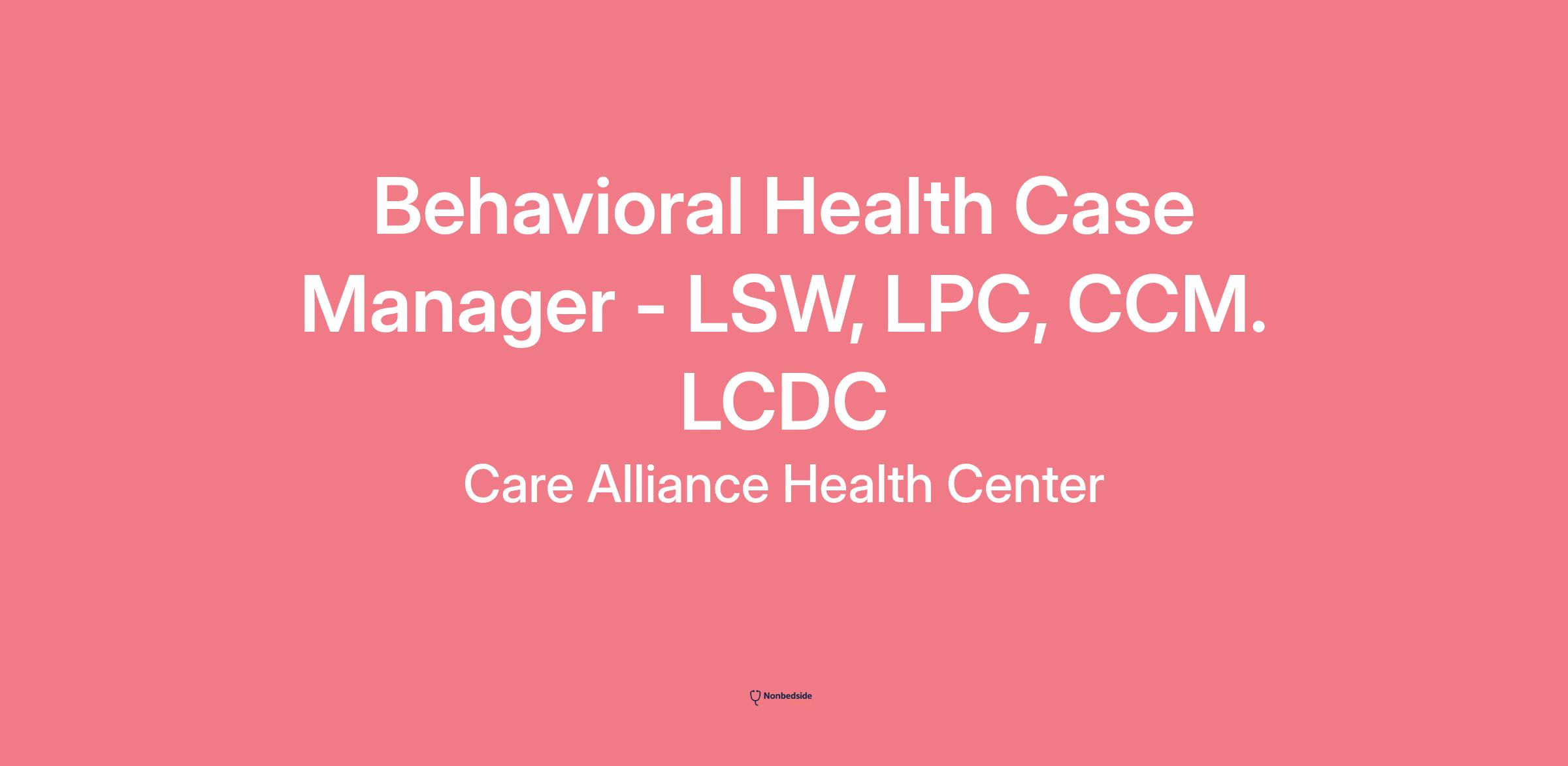 Join to apply for the Behavioral Health Case Manager - LSW, LPC, CCM. LCDC role at Care Alliance Health Center