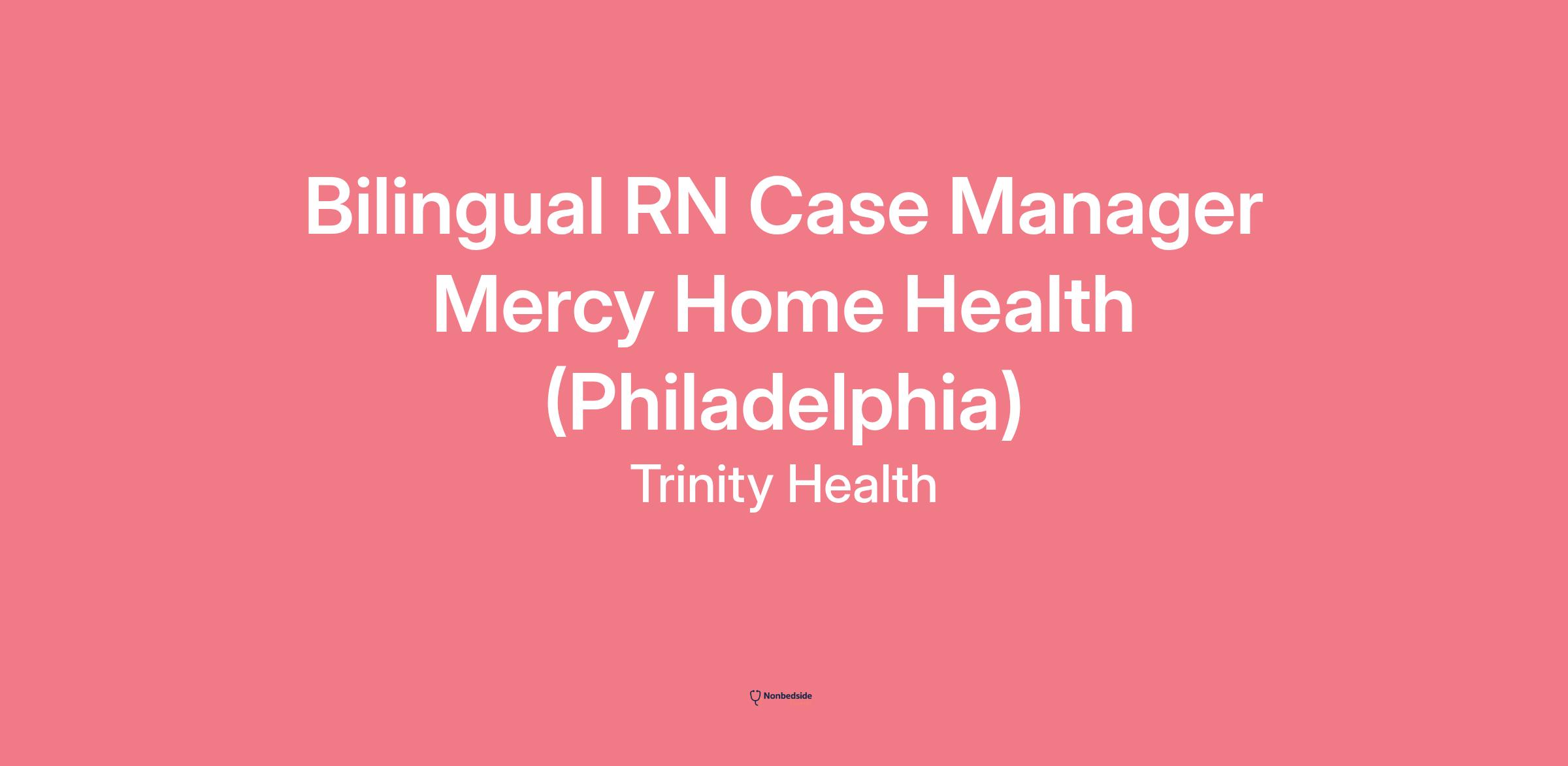 Mercy Home Health Philadelphia, Pennsylvania $10,000 bonus Position Overview As a Home Care Registered Nurse (RN) at Trinity Health at Home and Mercy Home Health, you'll deliver one-on-one, high-quality care to patients in the comfort of their homes. Using advanced technology and your clinical expertise, you'll assess, plan and manage individualized care that promotes healing and independence. This position is based out of our office on South Broad Street and will cover NORTH PHILADELPHIA.