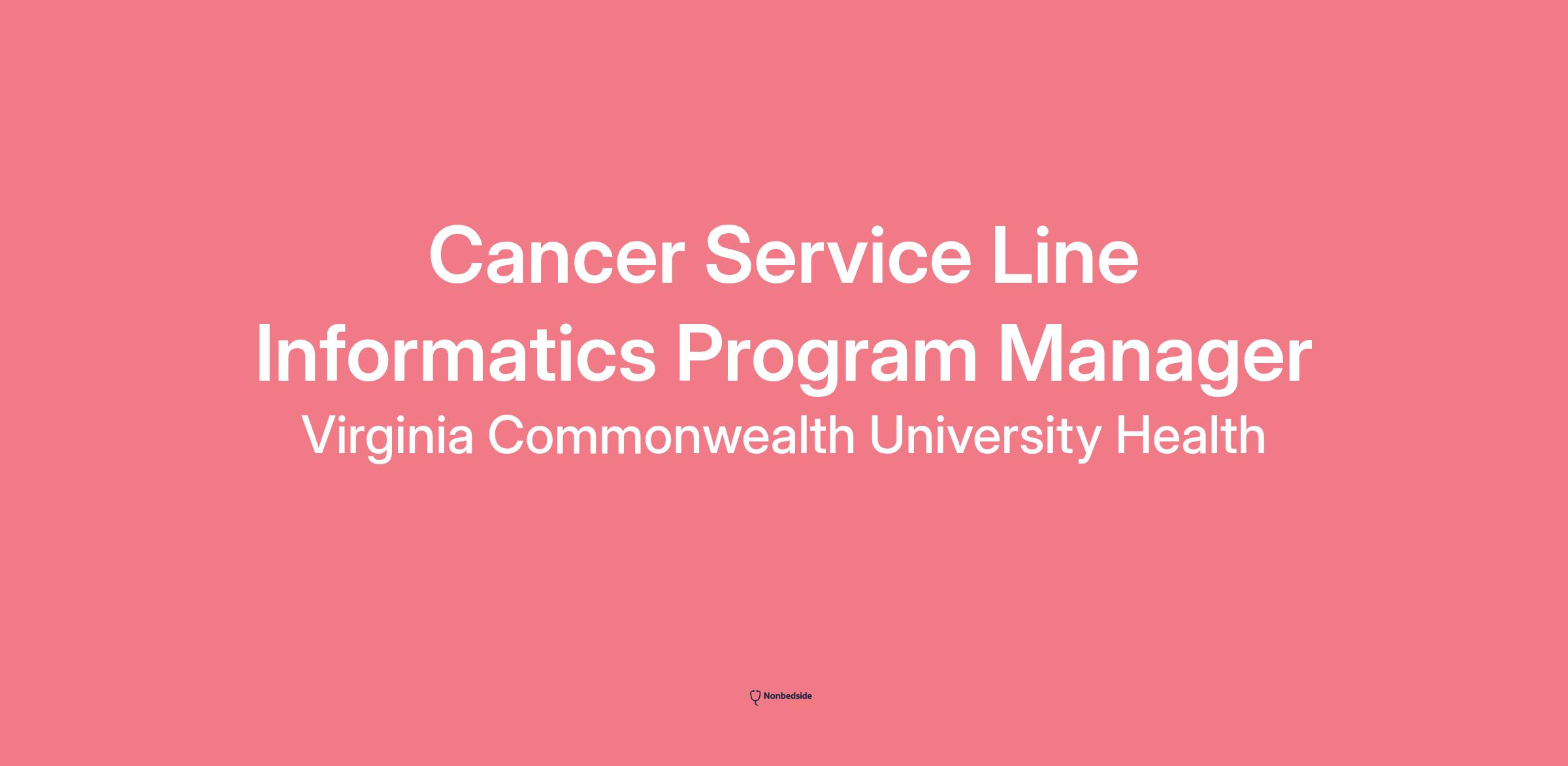 Cancer Service Line Informatics Program Manager page is loaded## Cancer Service Line Informatics Program Managerlocations: Richmond, VAtime type: Full timeposted on: Posted Todayjob requisition id: R38695The Cancer Service Line Informatics Program Manager leads the development and maintenance of metrics in support of Cancer Service Line governance, clinical operations, Tumor Programs, and clinical strategy implementation. The role supports metrics related to Research, Quality/Safety, QI, operations and Finance. The role develops key relationships and data sources horizontally related to research, EA, EHR, finance, ancillary clinical applications, etc, and will be the content expert for oncology specific initiatives. The role supports cancer leadership, providers and staff by managing systems such as reporting tools and dashboards. They organize stakeholder governance, define success benchmarks, maintain product roadmaps, and ensure alignment with enterprise resources and goals. This role requires deep expertise in Oncology, product management, and IT to effectively bridge business and technical teams.**Essential Job Statements**Stakeholder Communication & LiaisonAct as the primary liaison between Oncology users and IT, ensuring clear communication of requests, changes, and system tips, while aligning IT initiatives with enterprise goals.Governance & Stakeholder EngagementFacilitate Oncology IT stakeholder and governance groups, using governance principles to uphold quality, security, and compliance.Roadmap & PrioritizationMaintain and share product roadmaps, scope and prioritize optimization requests based on impact, and align them with user and business needs.Agile Methodology & Process Managemen**t**Implement and lead Agile development processes, managing request intake, execution, and communication effectively.Product & Industry ExpertiseServe as a subject matter expert on Oncology IT products, staying current on industry trends and vendor innovations.Solution Development & CollaborationCollaborate with cross-functional teams to identify and implement innovative IT solutions tailored to Oncology workflows.Requirements DocumentationCreate detailed business requirement documentation, user stories, and acceptance criteria to ensure alignment and clarity among stakeholders.Testing & Continuous ImprovementPartner with technical teams to validate system deliverables, establish feedback loops, and drive ongoing product improvements.Project ManagementLead Oncology IT projects by coordinating resources, managing timelines, and applying Agile project management practices.**Patient Population:** N/A**Employment Qualifications**Required Education: Requires a bachelor’s degree or equivalent experiencePreferred Education: N/A**Licensing/ Certification**Licensure/Certification Required: N/ALicensure/Certification Preferred: N/A**Minimum Qualifications**Years and Type of Required Experience: Requires at least 7 years of relevant experience with a strong background in product management, Agile methodologies, healthcare IT, and excellent communication and problem-solving skillsOther Knowledge, Skills and Abilities Required: N/ACultural Responsiveness: N/AOther Knowledge, Skills and Abilities Preferred: N/A**Working Conditions:** Periods of high stress and fluctuating workloads may occur. May have periods of constant interruptions. Prolonged periods of working alone.**Physical Requirements**Physical Demands: N/AWork Position: N/A**Additional Physical Requirements/ Hazards**Physical Requirements: N/AHazards: N/A**Mental/Sensory –Emotional**Mental/Sensory: Strong Recall, Reasoning, Problem Solving, Speak Clearly, Write Legibly, Reading, Logical ThinkingEmotional: Steady Pace, Able to Handle Multiple Priorities, Frequent and Intense Customer Interactions, Able to Adapt to Frequent ChangeEEO Employer/Disabled/Protected Veteran/41 CFR 60-1.4.