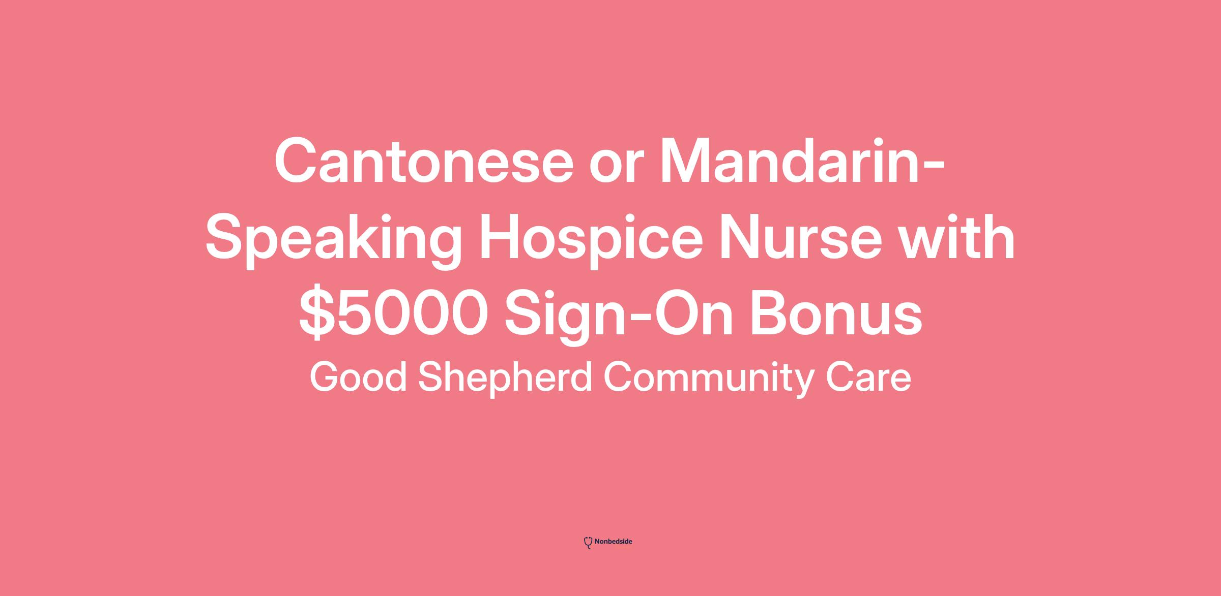 Overview Cantonese or Mandarin-speaking Hospice Nurse with a $5,000 sign-on bonus. Full-time position with local travel to patients’ private homes and residential facilities throughout Greater Boston and parts of MetroWest. Schedule is 40 hours per week, typically Monday through Friday, 9:00 am – 5:00 pm.