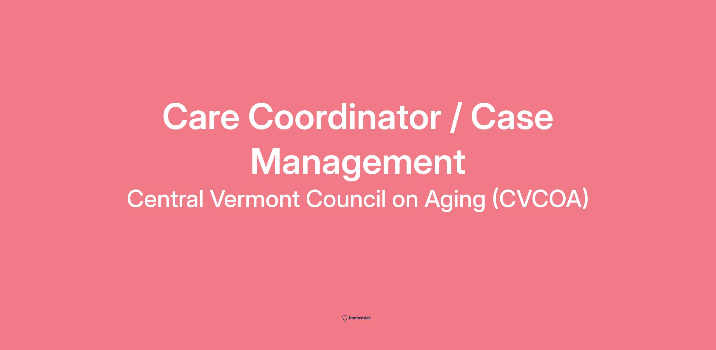 Position Overview Join to apply for the Care Coordinator / Case Management role at Central Vermont Council on Aging (CVCOA) .