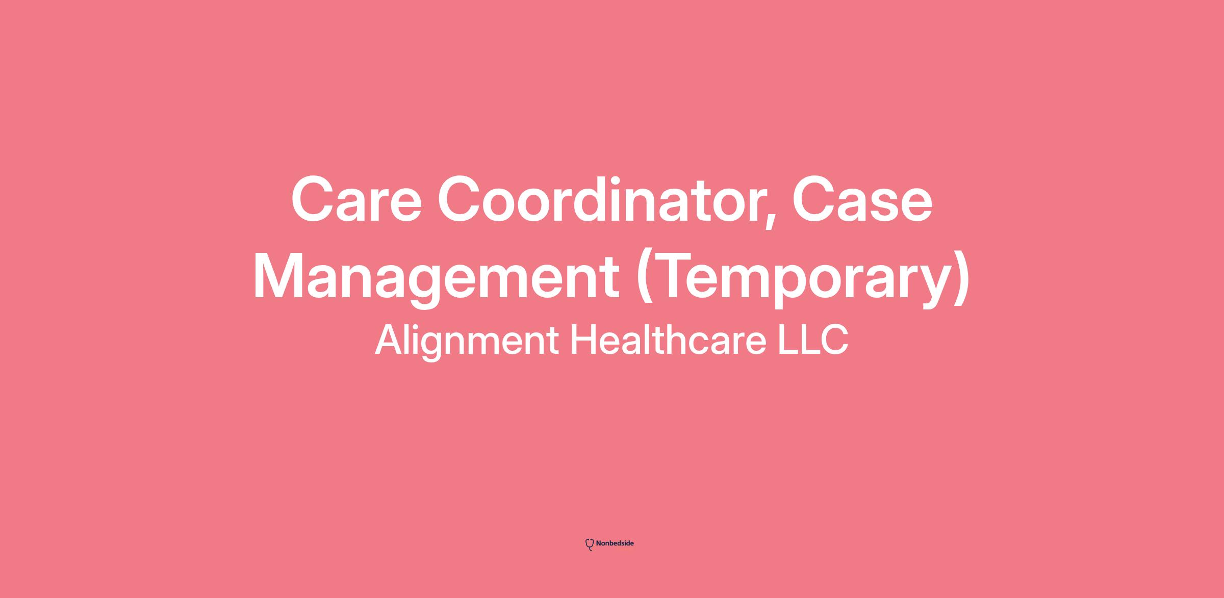 Alignment Health is breaking the mold in conventional health care, committed to serving seniors and those who need it most: the chronically ill and frail. It takes an entire team of passionate and caring people, united in our mission to put the senior first. We have built a team of talented and experienced people who are passionate about transforming the lives of the seniors we serve. In this fast-growing company, you will find ample room for growth and innovation alongside the Alignment Health community. Working at Alignment Health provides an opportunity to do work that really matters, not only changing lives but saving them. Together.Alignment Health is seeking a remote care coordinator to join the case management team for a long-term temporary engagement (with medical benefits.) The Care Coordinator works in collaboration with the RN Case Manager as part of the interdisciplinary team. The Care Coordinator supports members with closing care gaps and addressing care coordination needs as directed by the RN Case Manager. As part of the Case Management team is responsible for the health care management and coordination of care for members with complex and chronic care needs. The Care Coordinator is responsible for CM Coordinator functions for the members enrolled in Case Management. Please note: Alignment Health is continuing to expand so there is a possibility the position could extend and / or convert based on budget, business need, and individual performance. Schedule: Monday - Friday, 8:00 AM - 5:00 PM Pacific Time**GENERAL DUTIES / RESPONSIBILITIES:** 1. Reaches out to members telephonically to assist with referrals, authorizations, HHC, DME needs, medication refills, make provider appointments and follow ups, etc 2. Creates cases, tasks, and completes documentation in the Case Management module for all Hospital and SNF discharges 3. Complies with tasks assigned by nurse and, as appropriate and documents accordingly 4. Works as a team with the Case Manager to engage and manage a panel of members 5. Manages new alerts and updates Case Manager of changes in condition, admission, discharge, or new diagnosis 6. Establishes relationships with members, earns their trust and acts as patient advocate 7. Escalates concerns to nurse if members appear to be non-compliant or there appears to be a change in condition 8. Assists with outreach activities to members in all levels of Case Management Programs 9. Assists with maintaining and updating member’s records 10. Assists with mailing or faxing correspondence to members, PCP’s, and/or Specialists 11. Requests and uploads medical records from PCP’s, Specialists, Hospitals, etc., as needed 12. Meets specific deadlines (responds to various workloads by assigning task priorities according to department policies, standards and needs) 13. Maintains confidentiality of information between and among health care professionals 14. Other duties as assigned by CM Supervisor, Manager or Director of Care Management**Job Requirements:****Experience:**• Required: Minimum 1 year experience working in Health Care such as Health Plan, Medical office, IPA, MSO. Minimum 1 year experience assisting members/patients with authorizations, scheduling appointments, identification of resources, etc.• Preferred:**Education:**• Required: High School Diploma or GED. Bachelor's degree or four years additional experience in lieu of education.• Preferred: MBA**Training:**• Required:• Preferred: Medical Assistant training, Medical Terminology training.**Specialized Skills:**• Required:* Ability to read and interpret documents such as safety rules, operating and maintenance instructions and procedure manuals. Ability to write routine reports and correspondence. Communicates effectively using good customer relations skills.* Ability to communicate positively, professionally and effectively with others; provide leadership, teach and collaborate with others.* Problem-Solving Skills: Effective problem solving, organizational and time management skills and ability to work in a fast-paced environment.* Knowledge of Managed Care Plans* Knowledge of Medi-Cal* Basic Computer Skills, 25 WPM (Microsoft Outlook, excel, word)* Mathematical Skills: Ability to add and subtract two digit numbers and to multiply and divide with 10’s and 100’s. Ability to perform these operations using units of American money and weight measurement, volume, and distance.* Reasoning Skills: Ability to apply common sense understanding to carry out detailed but uninvolved written or oral instructions. Ability to deal with problems involving a few concrete variables in standardized situations.• Preferred: Bilingual (English/Spanish),**Licensure:**• Required: None• Preferred: Medical Assistant Certificate, Medical Terminology CertificateEssential Physical Functions:The physical demands described here are representative of those that must be met by an employee to successfully perform the essential functions of this job. Reasonable accommodations may be made to enable individuals with disabilities to perform the essential functions.1. While performing the duties of this job, the employee is regularly required to talk or hear. The employee regularly is required to stand, walk, sit, use hand to finger, handle or feel objects, tools, or controls; and reach with hands and arms.2. The employee frequently lifts and/or moves up to 10 pounds. Specific vision abilities required by this job include close vision and the ability to adjust focus.Work EnvironmentThe work environment characteristics described here are representative of those an employee encounters while performing the essential functions of this job. Reasonable accommodations may be made to enable individuals with disabilities to perform the essential functions.**Essential Physical Functions:**The physical demands described here are representative of those that must be met by an employee to successfully perform the essential functions of th