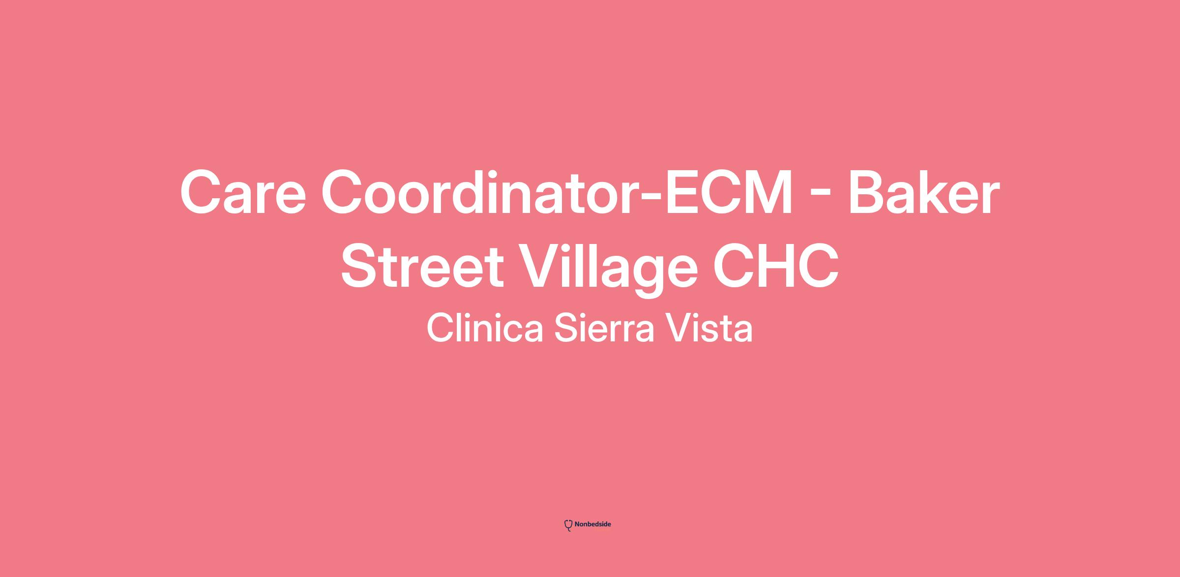 Overview Care Coordinator-ECM - Baker Street Village CHC role at Clinica Sierra Vista. Join to apply for the Care Coordinator-ECM - Baker Street Village CHC role at Clinica Sierra Vista.