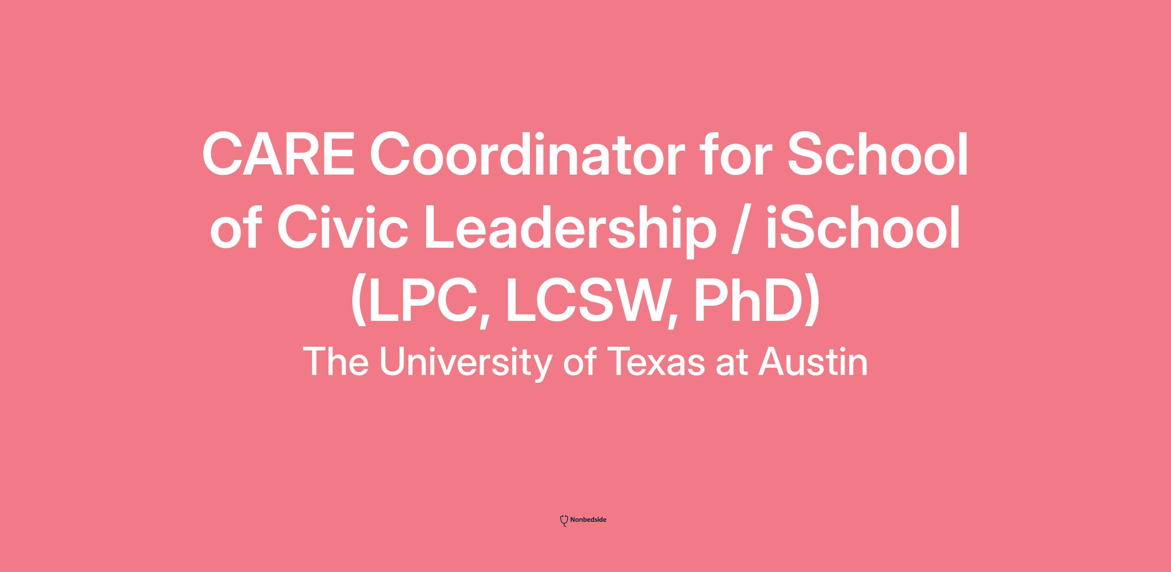 Responsibilities As CARE Coordinator, you will use your expertise to support the students enrolled in specific school or college at UT Austin. You will provide short-term individual and group counseling and outreach to students who seek services with our program. Outreach activities may include presentations to student enrolled in your supported school(s), campus partners, supervision and training of social work / psychology interns and post-doctoral psychology practicum students, and development of training materials used within your area.