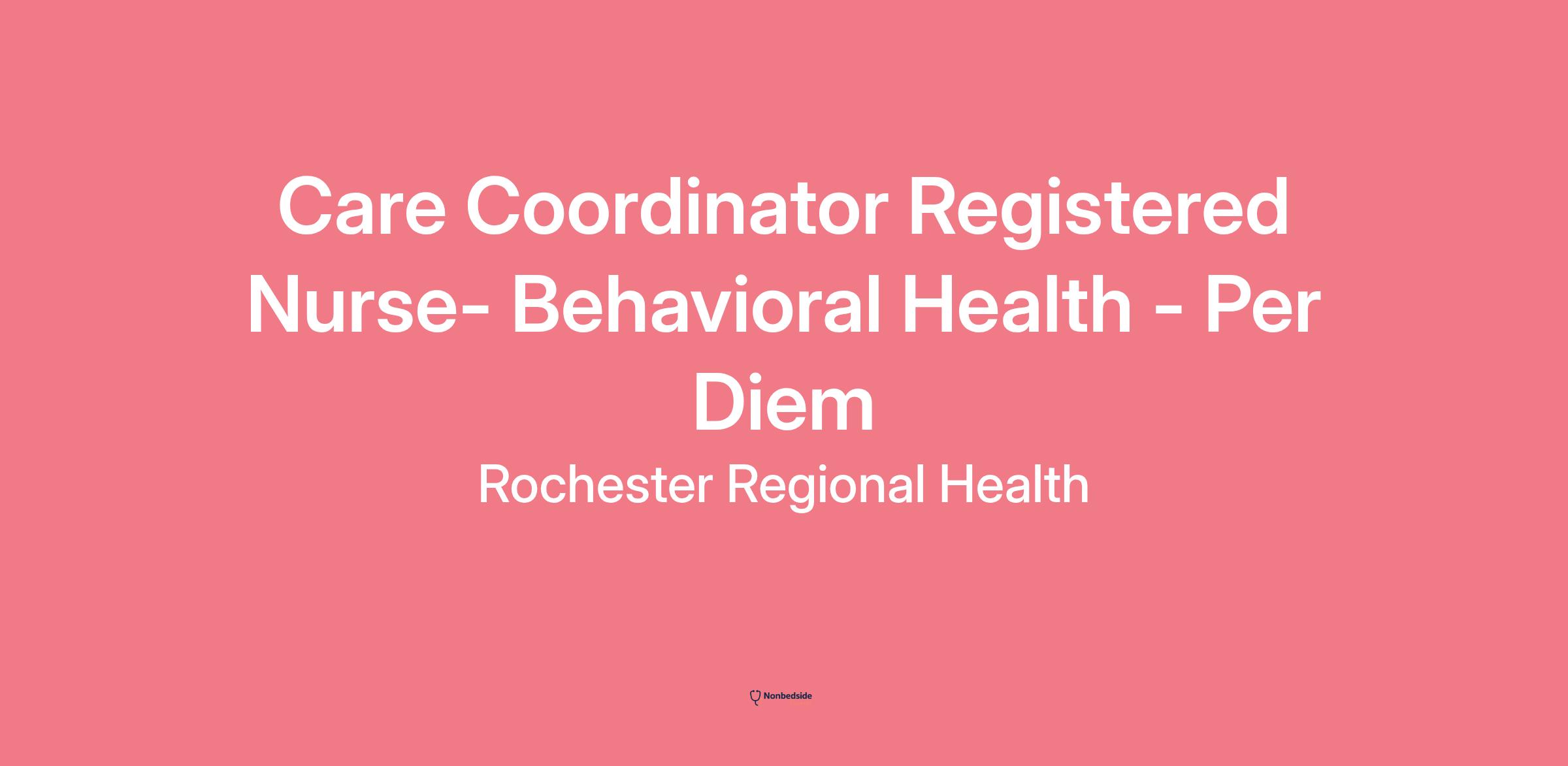 Overview Care Coordinator Registered Nurse - Behavioral Health - Per Diem. The Care Coordinator works in collaboration with chronically ill or “high-risk” patients and their family/caregivers, clinic/hospital/specialty providers, and community resources in a team approach. Facilitates a shared goal model within and across settings to achieve coordinated high-quality, patient- and family-centered care. Acts as a liaison between patients and the healthcare system to ensure patients receive the care they need and understand their medical condition, medications, and instructions. Coordinates patient-care services to help reduce costs by reducing duplication of services.