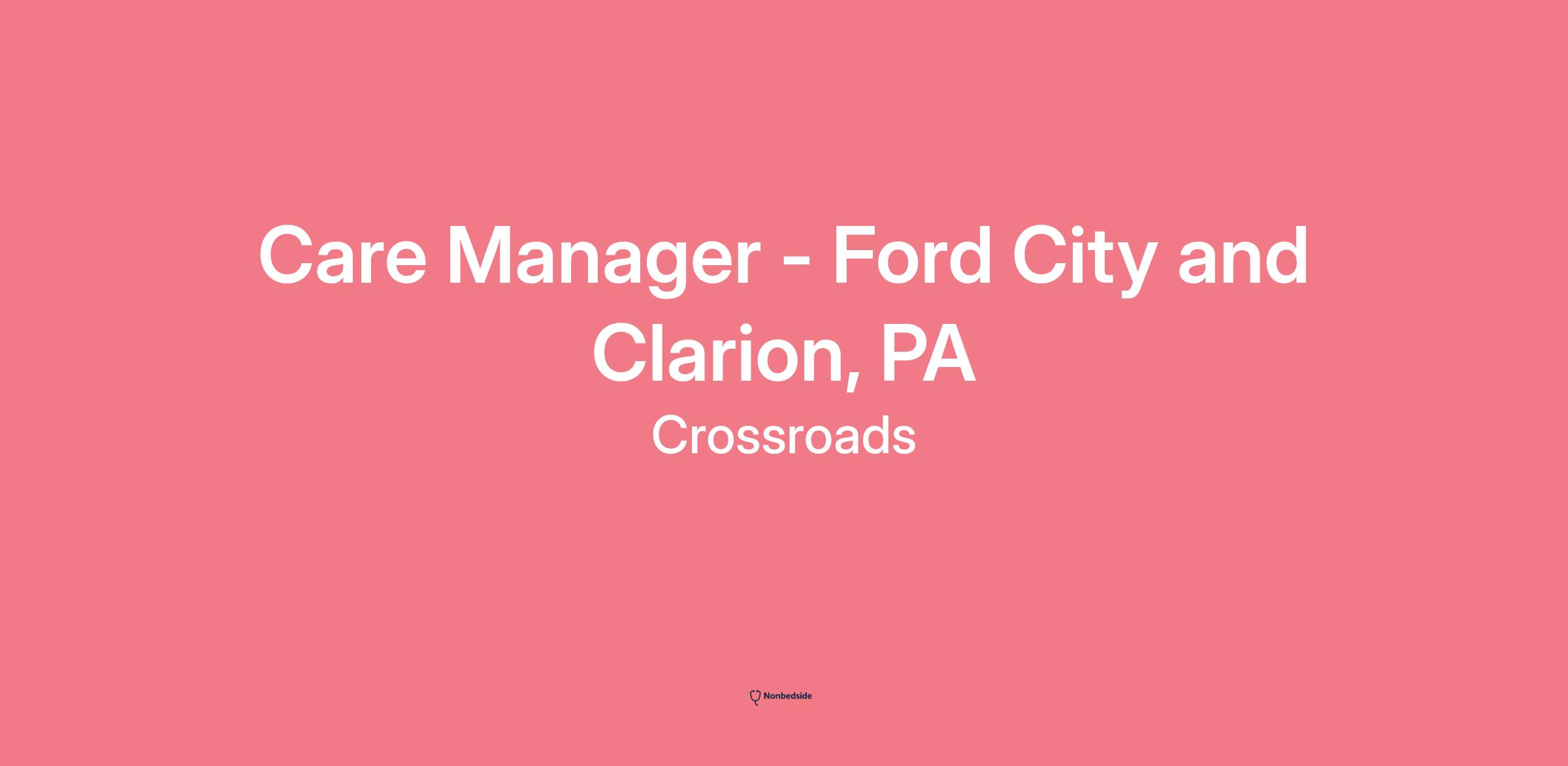 Care Manager - Ford City and Clarion, PA Crossroads Treatment Centers is an equal opportunity employer. We celebrate diversity and are committed to creating an inclusive environment for all employees. Since 2005, Crossroads has been at the forefront of treating patients with opioid use disorder. Crossroads is a family of professionals dedicated to providing the most accessible, highest quality, evidence-based medication assisted treatment (MAT) options to combat the growing opioid epidemic and helping people with opioid use disorder start their path to recovery. This comprehensive approach to treatment, the gold standard in care for opioid use disorder, has been shown to prevent more deaths from overdose and lead to long-term recovery. We are committed to bringing critical services to communities across the U.S. to improve access to treatment for over 26,500 patients. Our clinics are all outpatient and office-based, with clinics in Georgia, Kentucky, New Jersey, North and South Carolina, Pennsylvania, Tennessee, Texas, and Virginia. As an equal opportunity employer, we celebrate diversity and are committed to an inclusive environment for all employees and patients.