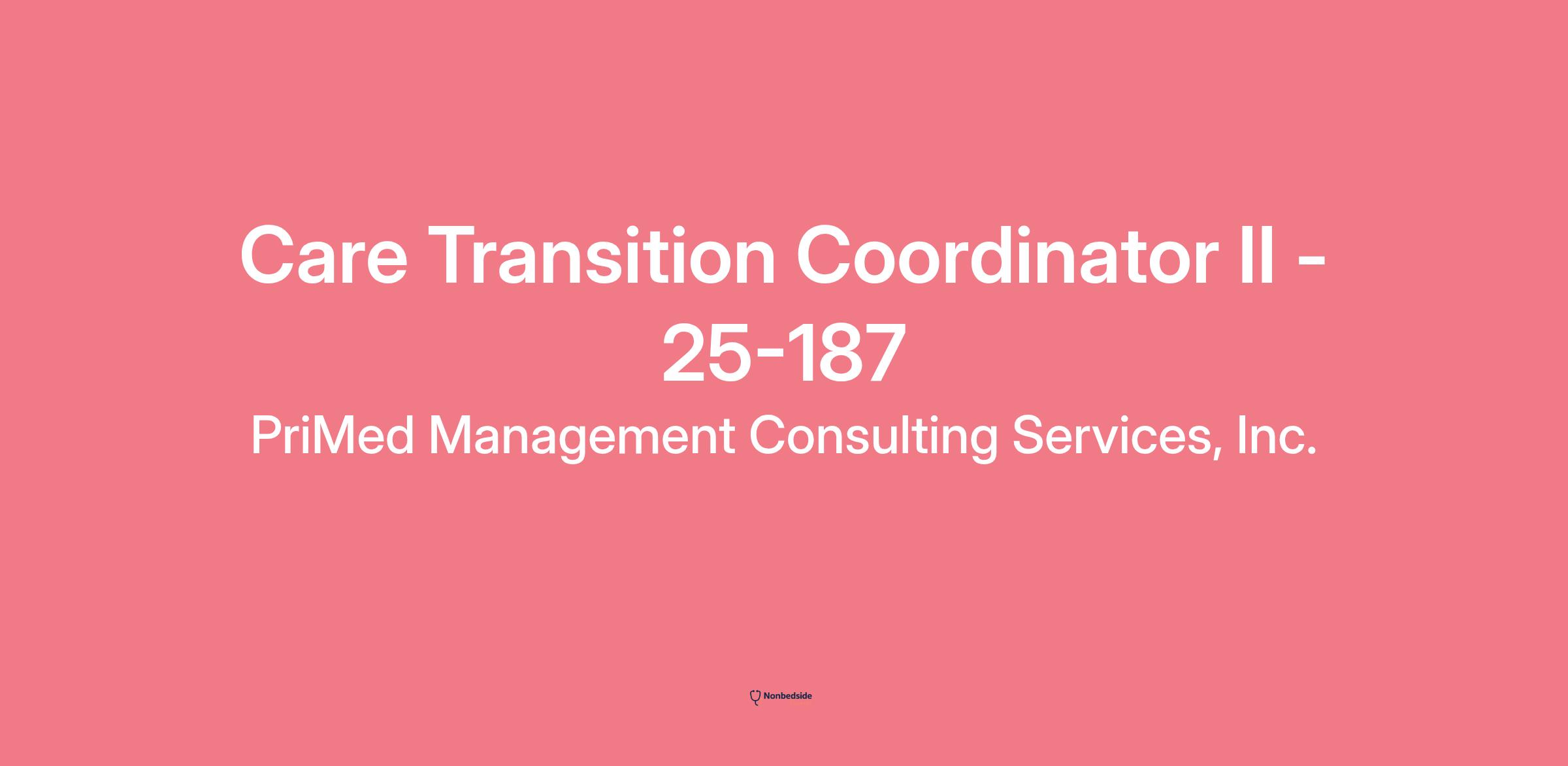 Care Transition Coordinator II - 25-187 page is loaded## Care Transition Coordinator II - 25-187locations: San Ramon, California: Sacramento, Californiatime type: Full timeposted on: Posted 3 Days Agojob requisition id: R2290**We’re delighted you’re considering joining us!**At Hill Physicians Medical Group, we’re shaping the healthcare of the future: actively managed care that prevents disease, supports those with chronic conditions and anticipates the needs of our members.**Join Our Team!**Hill Physicians has much to offer prospective employees. We’re regularly recognized as one of the “Best Places to Work in the Bay Area” and have been recognized as one of the “Healthiest Places to Work in the Bay Area.” When you join our team, you’re making a great choice for your professional career and your personal satisfaction.**DE&I Statement:**At PriMed, your uniqueness is valued, celebrated, encouraged, supported, and embraced. Whatever your relationship with Hill Physicians, we welcome ALL that you are.We value and respect your race, ethnicity, gender identity, sexual orientation, age, religion, disabilities, experiences, perspectives, and other attributes. Our celebration of diversity and foundation of inclusion allows us to leverage our differences and capitalize on our similarities to better serve our communities. We do it because it's right!**Job Description:**The CTC provides advanced administrative support by facilitating pre and post-acute care needs to avoid readmissions and ER visits. Serves as a liaison between hospital clinicians, providers, vendors, nursing facilities and HPMG Care Management staff. Capable of handling nonclinical activities within the full scope of Inpatient, Welcome Home, and Case Management functions as noted in the below “Essential Responsibilities” with a primary focus in one of these areas. Practices skills in the other two functional areas at least once a quarter or when asked of them. Duties such as: processing authorizations for discharge needs, scheduling PCP and specialist appointments, coordination of care at the bedside and PCP offices, and referring patients to appropriate Case Management staff. Monitors and tracks issues received to assure timely resolution and feedback communication to the referral source.**Job Responsibilities****Inpatient*** Completes intake process – facesheet receipt, verifies eligibility and builds referral into authorization, attaches clinical records and routes authorization to appropriate clinical queue within TAT requirements.* Verifies benefit details with the health plans.* Calculates LACE score at time of admission and documents in the authorization.* Assists nursing staff in obtaining clinical information from facilities and summarizes information for continuing nursing facility stays, processes letters as directed by the CCR/TOC nurses, and processes authorizations which require only administrative level of review.* Serves as contact to receive and process authorizations needed to support timely discharge from hospital or nursing facilities and subsequently routes cases to the appropriate care team.* Engages patient and caregivers upon admission to the hospital and throughout the hospital stay, discharge instructions, transition preparedness, follow-up appointments within 7 days of discharge, and care to assure the patient understands the treatment plan and is well prepared for transition to the next level of care, in coordination with the TOC/CCR nurse.* Shares the treatment/discharge plan created by the TOC nurse with member and appropriately communicates information so the patient is well prepared for transition to the next level of care.* Participates in physician/case management/concurrent review rounds as needed.* Completes ad hoc health plan drilldown requests.* Travels to hospitals in assigned regions in Sacramento, San Joaquin or the Bay Area, up to 100% of the time.* Maintains client privacy, safety, confidentiality, and advocacy while adhering to ethical, legal, regulatory and accreditation standards.* Performs other duties as assigned.**Welcome Home*** Receives in-basket notification of discharge and/or identifies discharge from hospital EMR, calculates discharge LACE score and routes case to appropriate team member following episode creation.* Uploads discharge summaries, medication list and other documentation to the Welcome Home episode in Epic.* Completes initial Welcome Home call to member within 36 hours for appropriate LACE score and refers high risk cases to Welcome Home nurse.* Follows up and addresses any needs identified during outreach call.* Sends letters externally as appropriate.* Collaborates with interdisciplinary team via telephonic outreaches to support implementation of the identified discharge plan.* Makes PCP follow-up appointment as soon as possible after discharge with primary care doctor (and with specialists as needed) for a visit for not more than 7 days after discharge.* Completes ad hoc health plan drilldown requests.* Travels to PCP offices in assigned regions in Sacramento, San Joaquin or the Bay Area, at minimum once per quarter or as needed.* Maintains client privacy, safety, confidentiality, and advocacy while adhering to ethical, legal, regulatory and accreditation standards.* Performs other duties as assigned.**Case Management*** Creates episode for referral to Case Management.* Runs LOH report, creates episode, makes initial outreach and refers case to health plan, Case Manager or Social Worker as deemed appropriate.* Outreaches to members for non-complex needs and updates chart notes.* Offers education to member about Case Management services and available resources in coordination with Case Managers.* Refers appropriate cases to designated staff as identified in workflows.* Enters transition notes upon referral to designated staff. Collaborates with interdisciplinary team via telephonic outreaches to support implementation of the identified disc