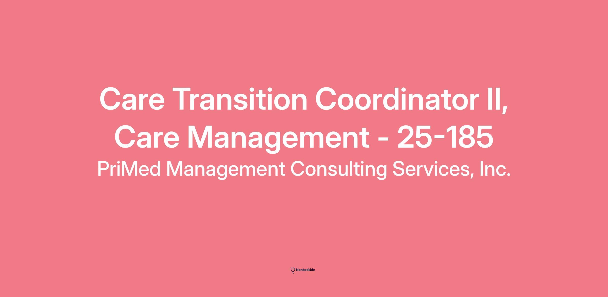 Care Transition Coordinator II, Care Management - 25-185 page is loaded## Care Transition Coordinator II, Care Management - 25-185locations: Sacramento, California: San Ramon, Californiatime type: Full timeposted on: Posted 4 Days Agojob requisition id: R2287**We’re delighted you’re considering joining us!**At Hill Physicians Medical Group, we’re shaping the healthcare of the future: actively managed care that prevents disease, supports those with chronic conditions and anticipates the needs of our members.**Join Our Team!**Hill Physicians has much to offer prospective employees. We’re regularly recognized as one of the “Best Places to Work in the Bay Area” and have been recognized as one of the “Healthiest Places to Work in the Bay Area.” When you join our team, you’re making a great choice for your professional career and your personal satisfaction.**DE&I Statement:**At PriMed, your uniqueness is valued, celebrated, encouraged, supported, and embraced. Whatever your relationship with Hill Physicians, we welcome ALL that you are.We value and respect your race, ethnicity, gender identity, sexual orientation, age, religion, disabilities, experiences, perspectives, and other attributes. Our celebration of diversity and foundation of inclusion allows us to leverage our differences and capitalize on our similarities to better serve our communities. We do it because it's right!**Job Description:**Proactively assist the Care Transition Manager with providing information to the patient regarding the transition of care. Develop relationships to facilitate discharge planning and continuum of care needs. Performs duties to avoid readmissions and ER visits to the hospital. Analyze and trend data to improve overall utilization metrics.**Job Responsibilities*** Educating the patient about what to expect, review criteria to determine benefit structure, authorize and approve benefits as medically necessary.* Engage the patient and caregivers upon admission to the hospital and throughout the hospital stay, discharge instructions, transition preparedness, follow-up appointments, and care, using teach-back methodology to assure the patient the patient understands the treatment plan and is well prepared for transition to the next level of care; in coordination with the Care Transition Manager.* Assists the unit nurse and Care Transition Manager with medication reconciliation at admission and near the time of discharge, assuring that medications are those that are likely to be continued as outpatient considering those on the formulary and the affordability.* Notifies the Primary Care Physician (PCP) of the patient’s admission to the hospital and facilitates a conversation between the hospital treating physician and the primary care doctor. Collaborates with interdisciplinary team to assure that the plan of care is well understood and documented in the medical record. Participates in rounds with physicians, case managers, social workers as needed. Assures the discharge documents are delivered to the PCP and to care management at Hill Physicians. Works closely with the onsite Case Manager and the Hill Concurrent Review nurse to assure post discharge services are authorized and planned at the longest time possible before discharge.* Assures that tests, consultations imaging studies, treatments and procedures are performed in a timely manner and that any barriers that might cause delays are identified. Contacts doctors or members of the care team when needed to move the patient’s care forward.* Makes PCP follow-up appointment as soon as possible after admission with primary care doctor (and with specialists as needed) for a visit for not more than 10 days after discharge. Assures that the appointment time is known by the patient, by the unit nurse, and is recorded on the discharge document; including the arrangement for home health, home infusion, durable medical equipment, skilled nursing and rehabilitation. The Transition Care Coordinator collaborates with the interdisciplinary team to assist in the implementation of the identified discharge plan.* Refers patients to Hill Physician Case Management for post-discharge ‘Welcome Home’ program,**In collaboration with the CTM and team:*** Provide resource information and referrals.* Interpret and coordinate health plan benefit coverage with member’s healthcare needs.* Refer patients to Health Education and Health Plan Disease Management programs as appropriate.* Coordinate all services and interventions with all participating providers and member by effective and timely communications.* Negotiate for out of benefit/network services and for cost effective healthcare utilization.**In collaboration with the CTM and team:*** Measure outcomes to determine if quality and cost effectiveness of case management is met.* Examples of outcomes data include, but are not limited to member surveys, quality of life, clinical, and financial data.* Participate in Quality Improvement activities by analyzing quality data, such as member survey results, and recommend opportunities for improvement.* Maintain client privacy, safety, confidentiality, and advocacy while adhering to ethical, legal, regulatory and accreditation standards.**In collaboration with the CTM and team:*** Support the interdisciplinary team approach to ensure effective resource utilization, as well as quality and cost-effective outcomes.* Coordinate internal and external resources for the individual member.* Utilize existing reports and systems to identify and monitor utilization resource patterns and facilitate needed care coordination in order to support Quality Improvement.* Refer to Hill Concurrent Review Supervisor for supportive interventions as needed, i.e., Health Education, Quality Management, etc.* Assures that patients whose surgeon desires co-management are seen by consultant or hospitalist.* If determined of benefit to the patient, arranges visit by a home-visiting physician 