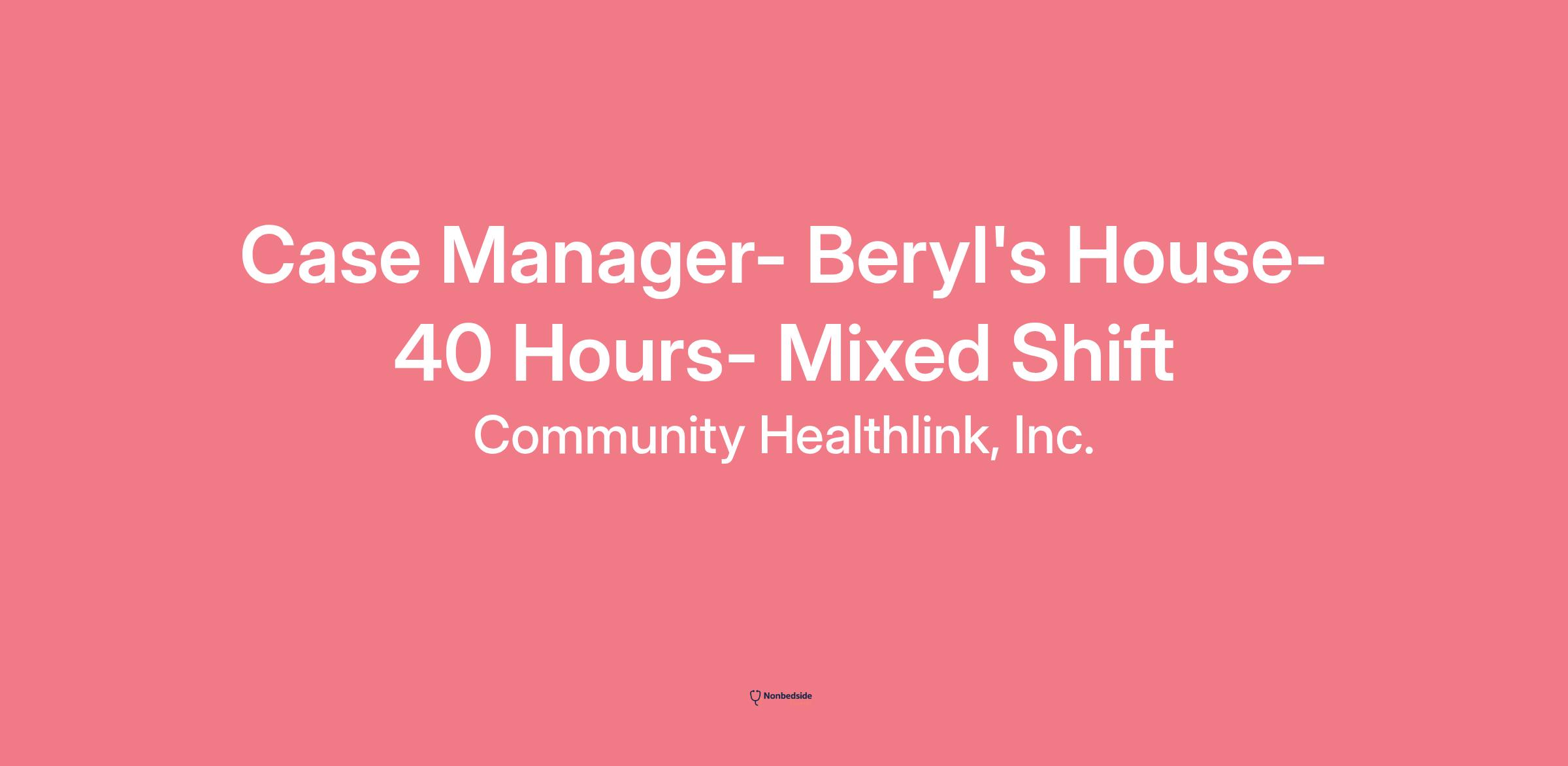 Case Manager- Beryl's House- 40 Hours- Mixed Shift page is loaded Case Manager- Beryl's House- 40 Hours- Mixed Shift Apply remote type On-site (100% Onsite) locations Worcester, MA time type Full time posted on Posted Yesterday job requisition id R25107293 Are you a current UMass Memorial Health caregiver? Apply now through Workday. Exemption Status: