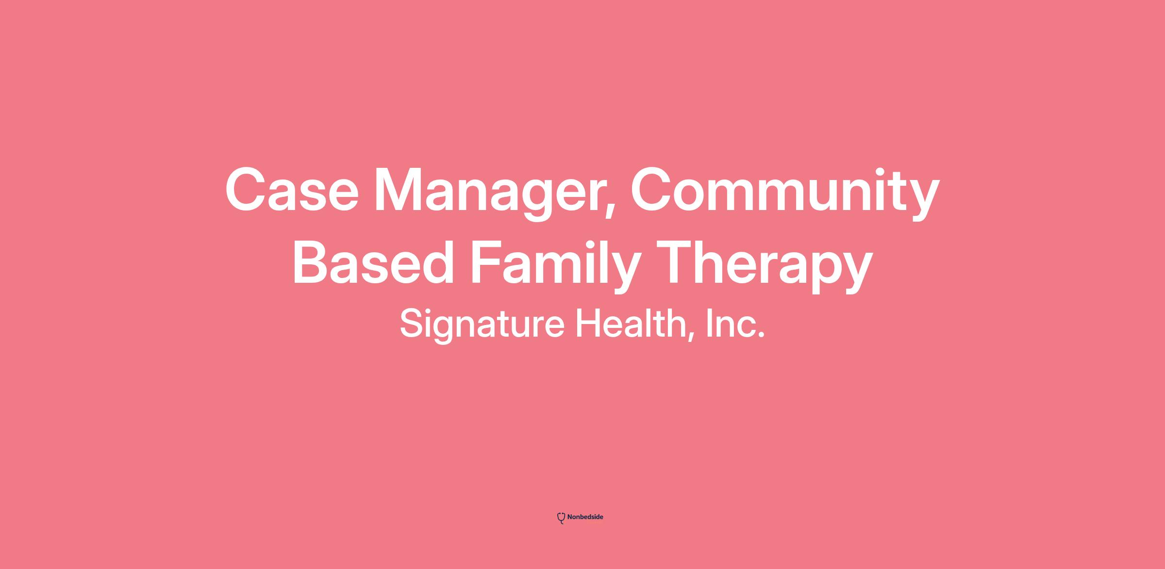 Case Manager, Community Based Family Therapy At Signature Health, our purpose is to provide integrated healthcare for our community specializing in patients with mental illness and/or addiction because we want people to realize their highest potential. If you align with our core values, putting people first, striving for excellence in the work you do each day and have a can-do mindset, then Signature Health is the best place for the next step in your rewarding career. As a full-time employee, you will have access to the following employer/employee paid benefits: