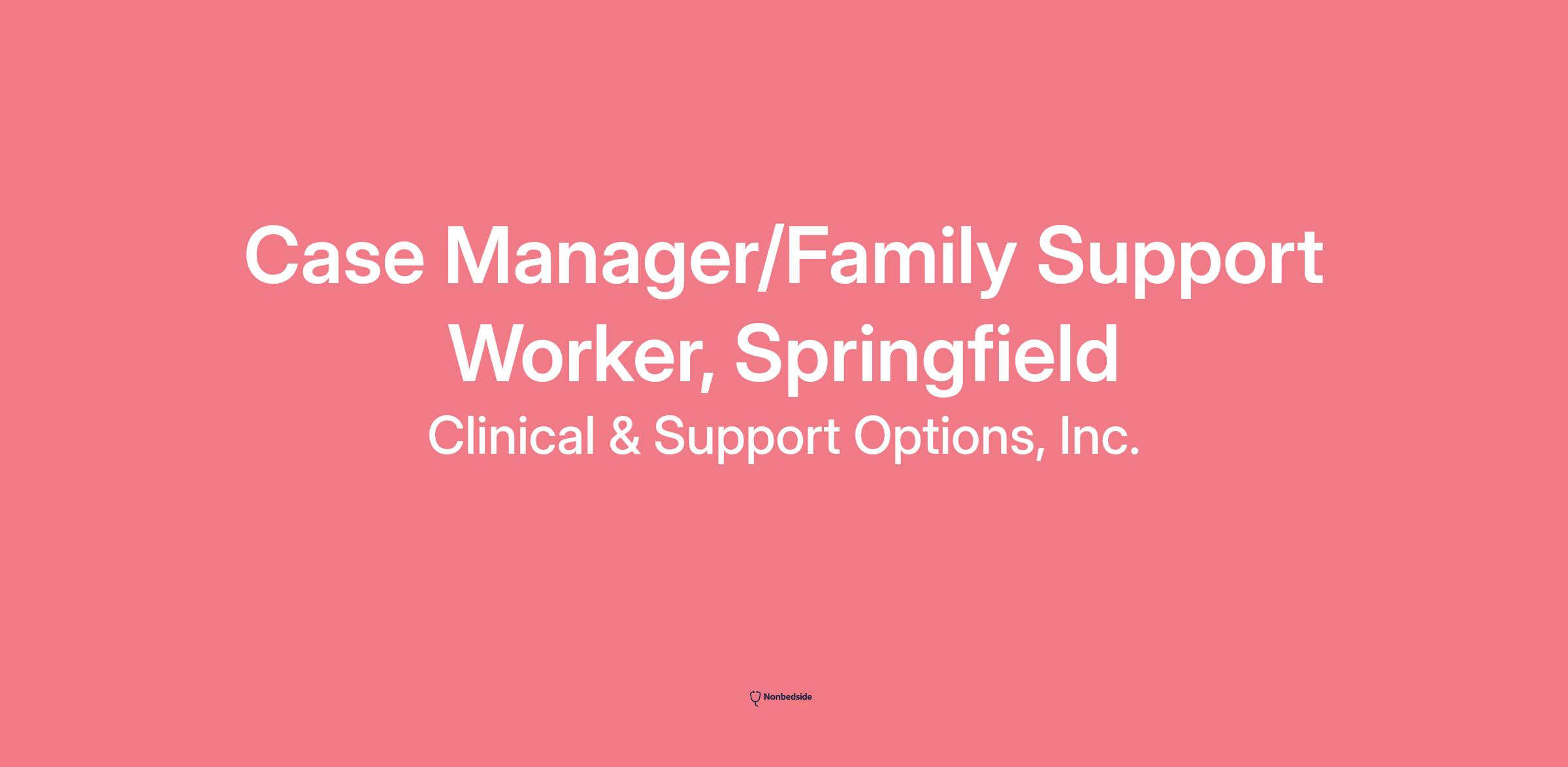 Overview CSO is looking for a Case Manager to join our Family Support Services team in Springfield. Family Support Workers provide community-based direct care services to children, adults, and families. This includes crisis stabilization, ongoing support and case management through the state's Children's Behavioral Health Initiative. The main focus of these services is to alleviate the youth's mental health issues and strengthen the family structures and supports. Family support services are delivered in the home or community and are not time-limited; the frequency and duration match the need.