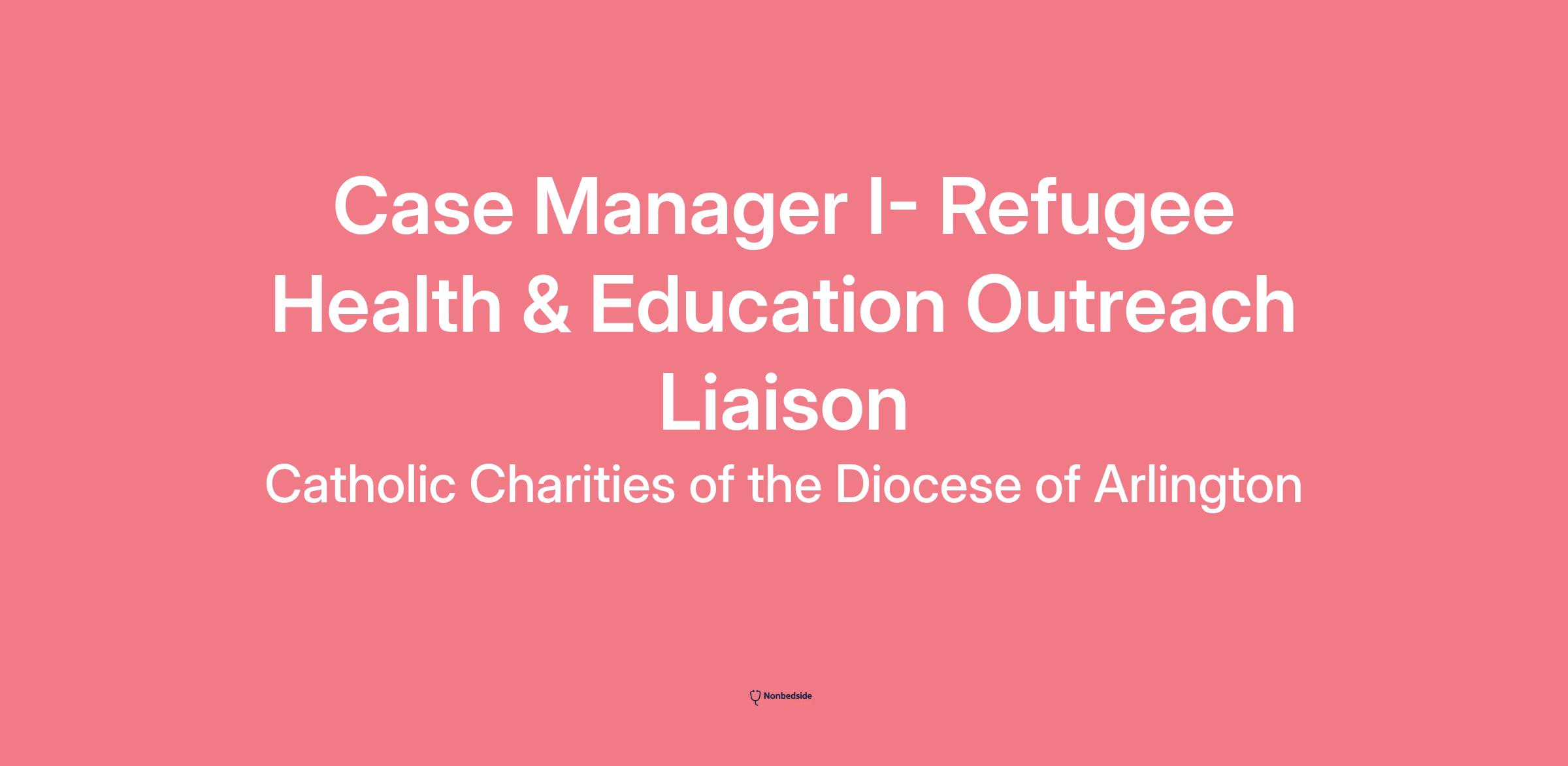 Case Manager I- Refugee Health & Education Outreach Liaison Job Description Catholic Charities seeks to implement the Church's mission of social justice in the Diocese of Arlington in ways that strengthen individuals, families, and communities. In addition to a purpose-based work environment, CatholicCharities offers a generous benefit package including medical plans, generous holiday leave, paid Family Medical Leave*, flexible work options, career development, Diocesan tuition reimbursement*, retirement plans and much more.