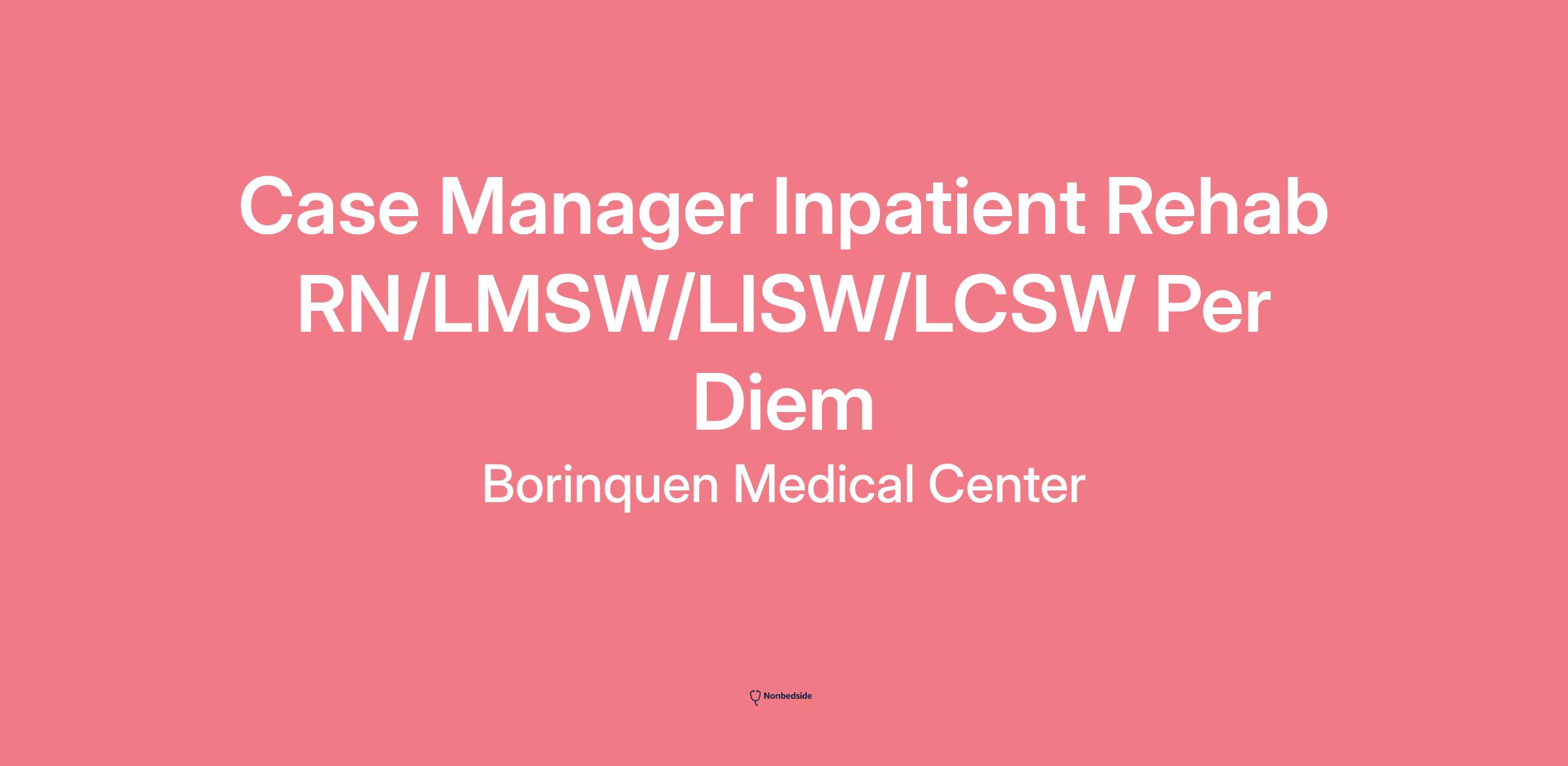 Overview Join to apply for the Case Manager Inpatient Rehab RN/LMSW/LISW/LCSW Per Diem role at Borinquen Medical Center .