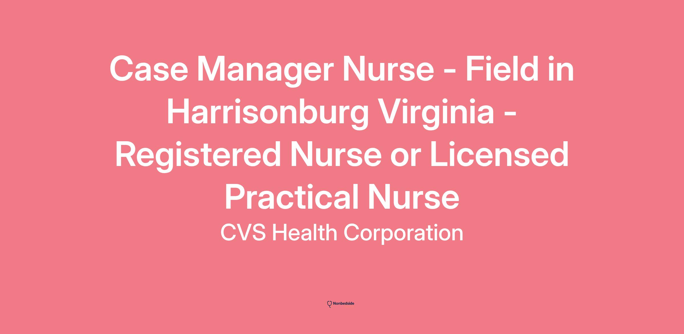 At CVS Health, we’re building a world of health around every consumer and surrounding ourselves with dedicated colleagues who are passionate about transforming health care.As the nation’s leading health solutions company, we reach millions of Americans through our local presence, digital channels and more than 300,000 purpose-driven colleagues – caring for people where, when and how they choose in a way that is uniquely more connected, more convenient and more compassionate. And we do it all with heart, each and every day.***Must reside in or near Harrisonburg VA*****Position Summary:**### This Case Management position is with Aetna’s Long-Term Services and Supports (LTSS) team and is a field-based position out of Harrisonburg Virginia. The requirements is for candidates to hold a Virginia RN or LPN License, and travel up to 50-75% of the time to meet with members face to face**.**### ### **The Nurse Case Manager** is responsible for evaluating and coordinating care for members to improve their overall health and wellness. This includes:* ### Assessing medical needs and eligibility.* ### Developing care plans to address short- and long-term health goals.* ### Using clinical tools and data to guide decisions.* ### Coordinating services across programs and providers.* ### Addressing complex health and social issues.* ### Reviewing claims and functional capacity.* ### Referring members to appropriate clinical resources.* ### Collaborating with supervisors and multidisciplinary teams.* ### Ensuring compliance with policies and regulations.* ### Engaging members through effective communication.### W**ork Location & Travel Requirements:** This is a **Work-at-Home (WAH)** position based out of the candidate’s residence in Harrisonburg, VA, with **up to 75% field travel**. The role requires a secure, HIPAA-compliant home workspace with reliable phone and hard-wired internet service. Work hours are Monday through Friday, 8 AM to 5 PM EST. Colleagues must be accessible via phone, videoconference, and email during scheduled hours and ensure that personal responsibilities, including dependent care, do not interfere with work duties. As a **field-based role**, the Nurse Case Manager will regularly travel to various locations including member homes, healthcare facilities (e.g., nursing homes, rehab centers), community sites, and client or company locations. Unlike office-based roles, field-based colleagues do not have a single primary worksite and may work in multiple locations throughout the week or month.### **Required Qualifications:*** ### Candidates must reside in or near Harrisonburg, VA* ### Must possess reliable transportation and be willing and able to travel up to 50-75% of the time. Mileage is reimbursed per our company expense reimbursement policy* ### LPN/RN with current unrestricted Virginia state licensure required.* ### 3 years Clinical Experience (Preferably in Medical-Surgical Nursing, Behavioral Health, Long term Care, etc.)* ### 1+ years Managed Care experience.* ### Position requires proficiency with computer skills which includes navigating multiple systems and keyboarding.### ### **Preferred Qualifications*** ### Case Management in an integrated model preferred (Waiver and IDDP-Combination of different services)* ### Bilingual in English/Spanish### **Education:**### Associates degree in Nursing Required; prefer a BSN### **Technology Skills:*** ### Proficient in Multisystem Navigation: Comfortable using multiple monitors and systems simultaneously to streamline tasks and improve efficiency.* ### Effective Multitasker: Skilled at talking and typing concurrently while managing various responsibilities with focus and accuracy.* ### Basic Technical Troubleshooting: Able to set up and connect essential hardware (monitors, keyboards, etc.) and resolve common technical issues independently.* ### Digital Collaboration & Documentation: Experienced in electronic documentation and virtual collaboration tools to support remote teamwork and communication.* ### Highly Organized & Results-Oriented: Maintains a structured approach to work, ensuring tasks are completed on time and in alignment with performance metrics.* ### Metric-Driven Performance: Demonstrates accountability by consistently meeting or exceeding established goals and expectations.* ### Clean & Efficient Workspace Management: Keeps workspaces tidy and organized to support productivity and comply with professional standards**Anticipated Weekly Hours**40**Time Type**Full time**Pay Range**The typical pay range for this role is:$60,522.00 - $129,615.00This pay range represents the base hourly rate or base annual full-time salary for all positions in the job grade within which this position falls. The actual base salary offer will depend on a variety of factors including experience, education, geography and other relevant factors. This position is eligible for a CVS Health bonus, commission or short-term incentive program in addition to the base pay range listed above. Our people fuel our future. Our teams reflect the customers, patients, members and communities we serve and we are committed to fostering a workplace where every colleague feels valued and that they belong.**Great benefits for great people**We take pride in our comprehensive and competitive mix of pay and benefits – investing in the physical, emotional and financial wellness of our colleagues and their families to help them be the healthiest they can be. In addition to our competitive wages, our great benefits include:* **Affordable medical plan options,** a **401(k) plan** (including matching company contributions), and an **employee stock purchase plan**.* **No-cost programs for all colleagues** including wellness screenings, tobacco cessation and weight management programs, confidential counseling and financial coaching.* **Benefit solutions that address the different needs and preferences of our colleagues** including paid time off, flexible work schedu