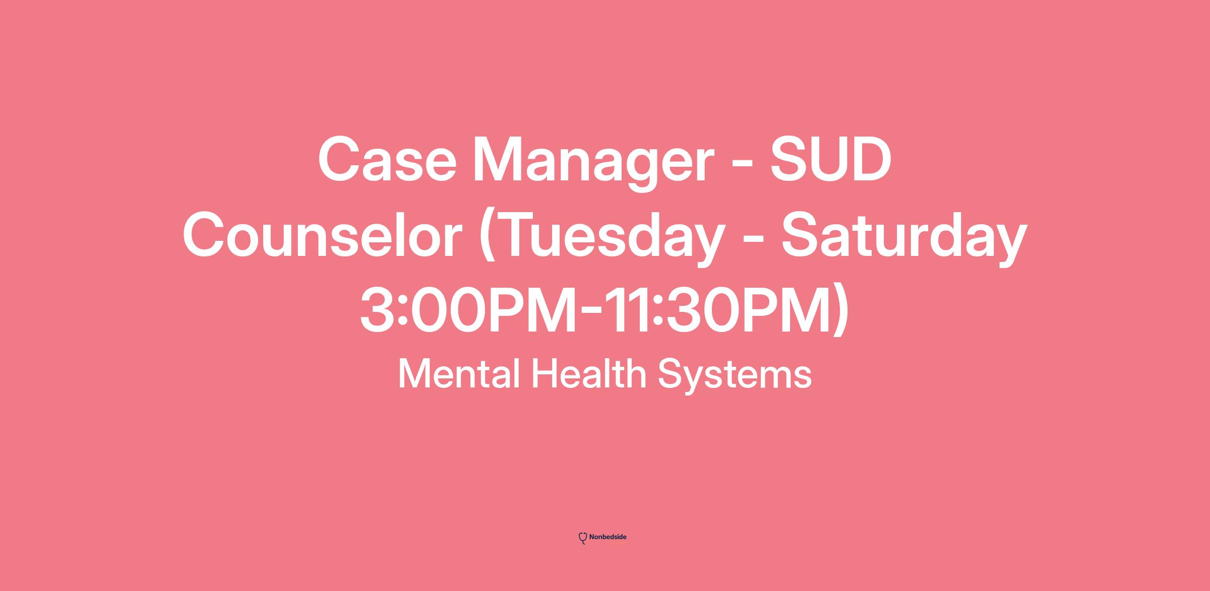 Join to apply for the Case Manager - SUD Counselor (Tuesday - Saturday 3:00PM-11:30PM) role at Mental Health Systems .