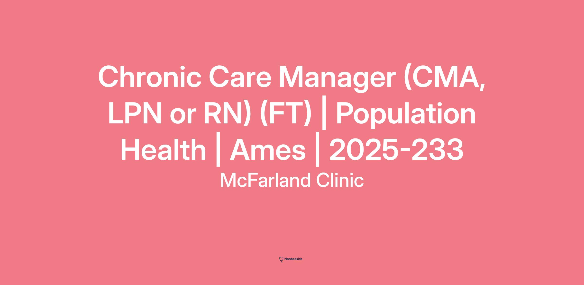 Join to apply for the Chronic Care Manager (CMA, LPN or RN) (FT) | Population Health | Ames | 2025-233 role at McFarland Clinic