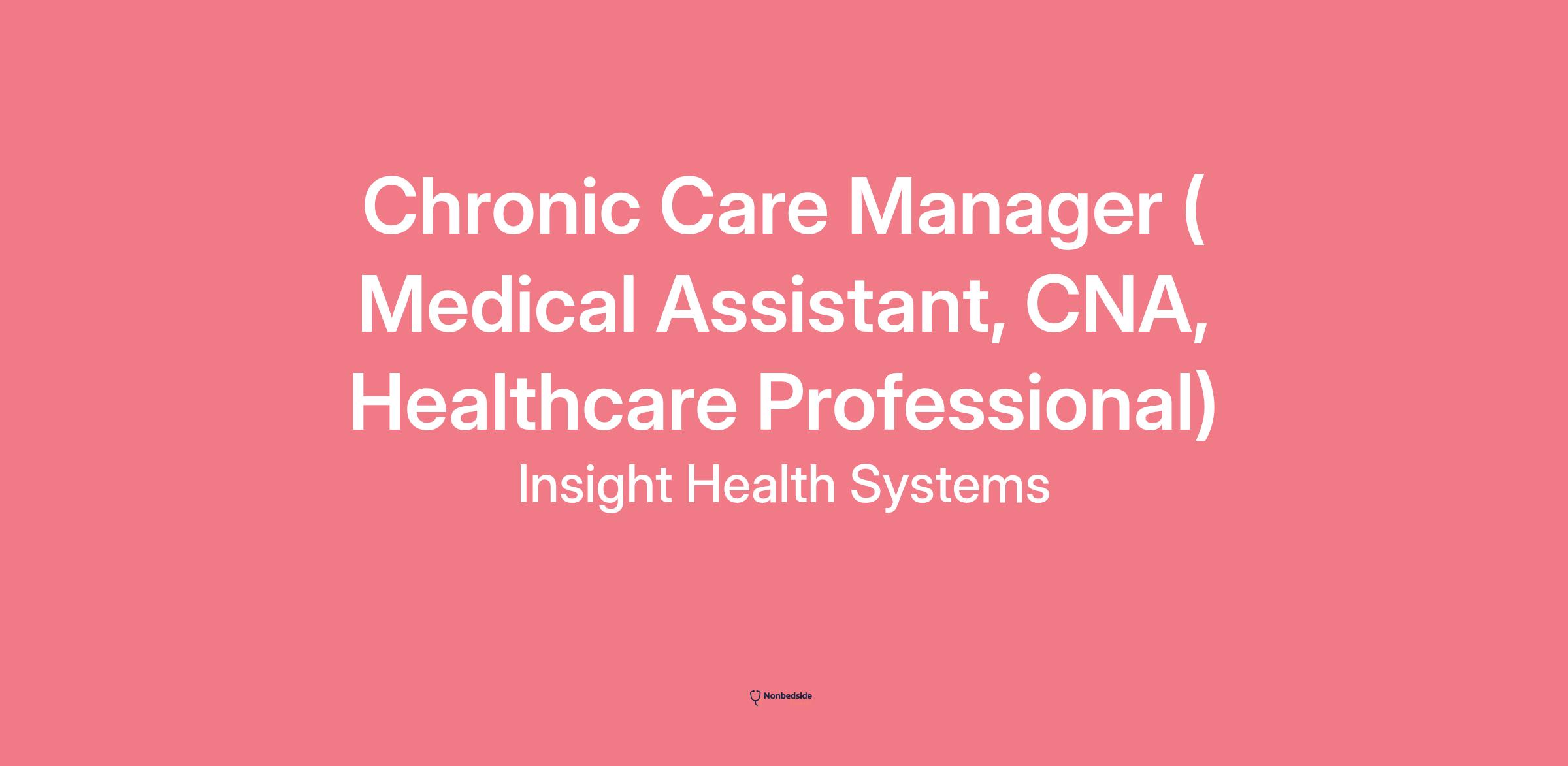 Overview Chronic Care Manager (Medical Assistant, CNA, Healthcare Professional) at Insight Health Systems. The CCM is responsible for managing a panel of patients with chronic conditions, providing non-face-to-face care management services, ensuring continuity of care, and assisting patients in navigating their health journey. This is a remote position requiring a HIPAA-compliant private workspace with reliable internet and the ability to use multiple web-based tools and electronic health record (EHR) systems.