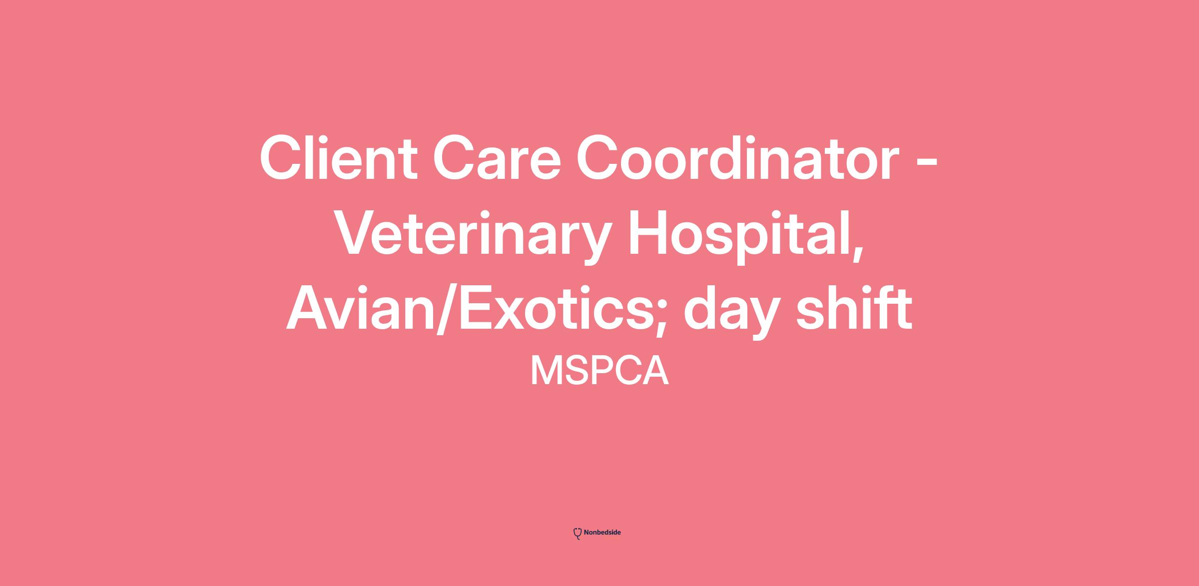 This Client Care Coordinator position is an essential piece of our Avian and Exotics (AE) team. In this role, you will work collaboratively with our AE team to ensure seamless delivery of excellent client service from the patient's point of admission to the point of discharge. This impactful role provides daily opportunity to make a positive difference in the quality of life of our patients and clients. The Coordinator will act as an integral point person for both clients and clinical staff. In addition to providing support for AE patients and clients, this position also provides supplementary coverage support to other specialty services, offering the opportunity to learn about and work within a variety of highly specialized departments. Ideal applicants will have at least 2 years experience in a hands-on and/or client service role in a veterinary facility, animal shelter/humane society, or other animal related field. Relative experience in a human medical position is also welcomed.