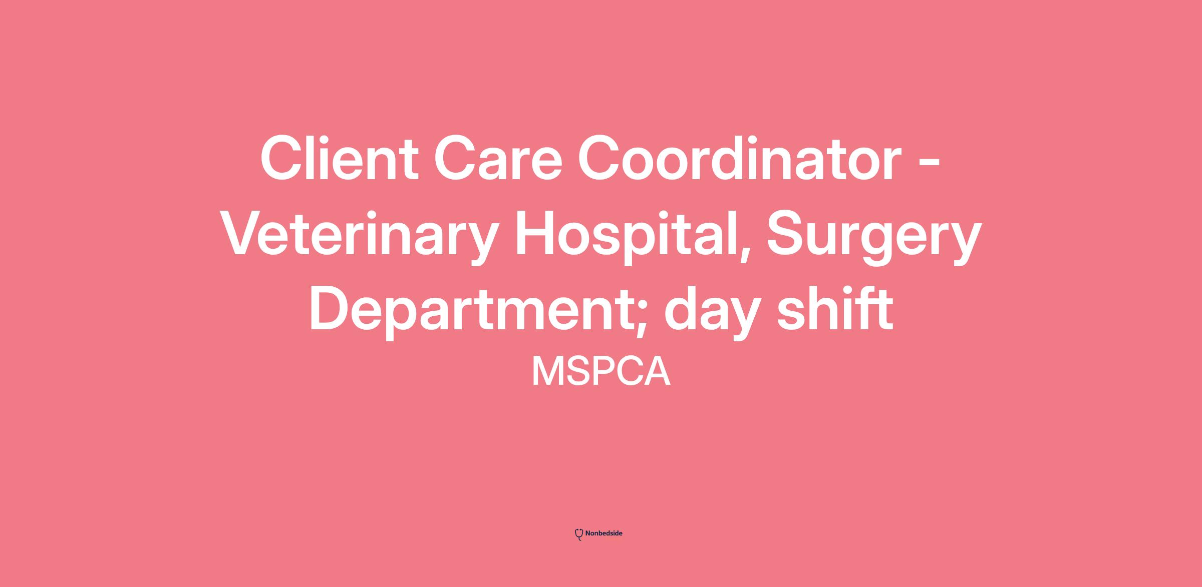 This is a full time 40-hour, Monday-Friday position. First shift hours from 6am-2:30pm. This Client Care Coordinator position is an essential part of our renowned Surgery service. In this specialized role, you will work collaboratively with our surgeons, technicians, and support staff in our Surgery Department to ensure seamless delivery of excellent client service while a pet is hospitalized. This impactful role provides daily opportunity to make a positive difference in the quality of life of our patients and clients. The Coordinator will act as an integral point person for both clients and surgical veterinary staff; liaising information, facilitating patient movement within the hospital, and providing our clients with a valuable resource during their pet's surgical hospitalization. Ideal applicants will have at least 2 years experience in a hands-on and/or client service role in a veterinary facility, animal shelter/humane society, or other animal related field. Relative experience in a human medical position is also welcomed.