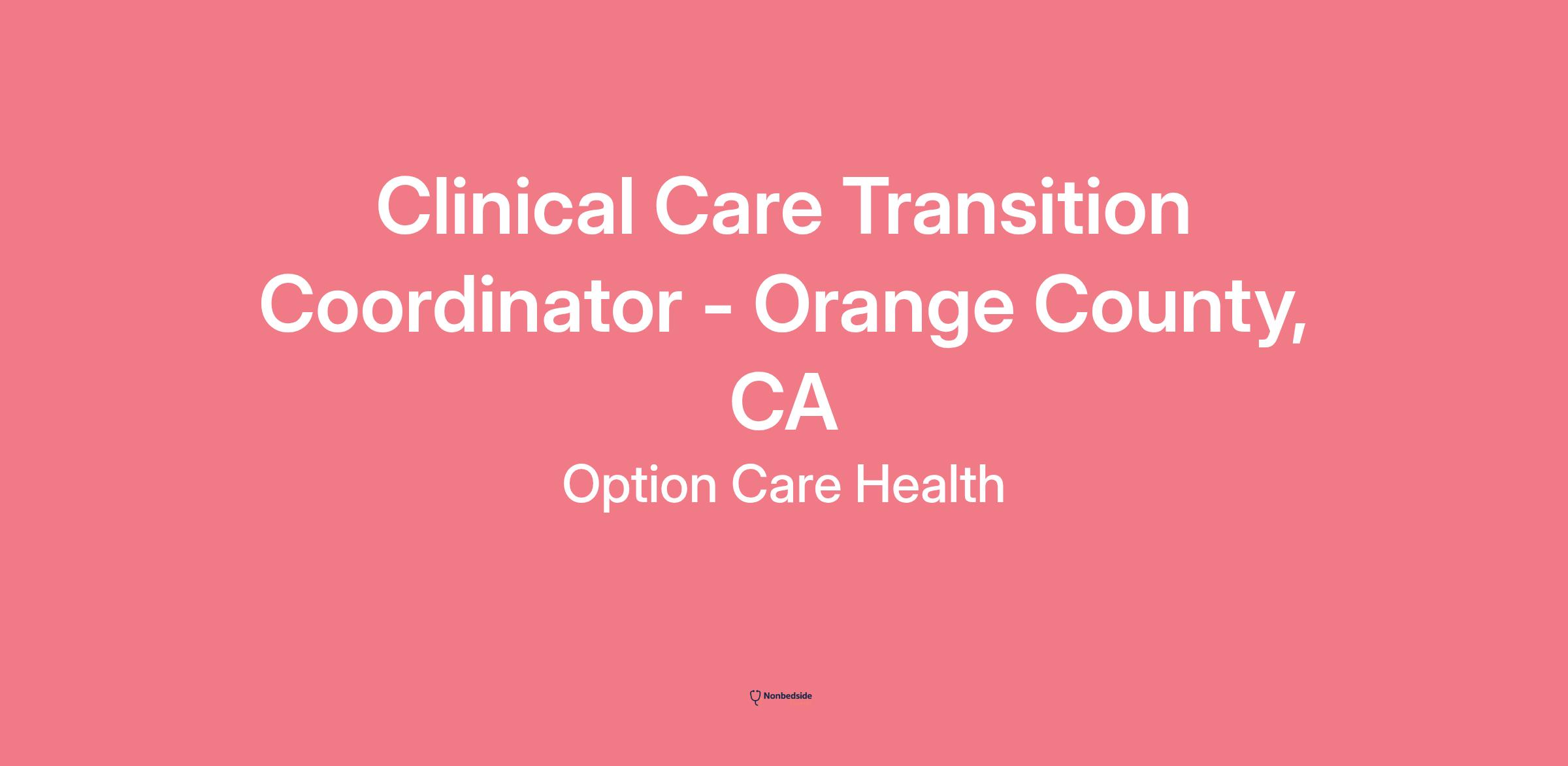 Job Description Summary The Care Transition Coordinator is an experienced sales professional who uses sales techniques to sell Option Care products and services to patients discharging from hospital care. They are responsible for educating patients, their families and the facility staff about how the services and products will be facilitated at an alternative site. Care Transition Coordinators ensure proper placement of patients within the Home Health Care setting by communicating with patient, gathering preadmission information, collaborating with internal (intake) and external (case managers, discharge planners) partners to ensure quality of service and the data required for the creation and implementation of an effective treatment plan by the clinical team. Care Transition Coordinators are also responsible for proactively building strong relationships with referral sources and partnering with Account Managers to grow referral rates and achieve sales goals.