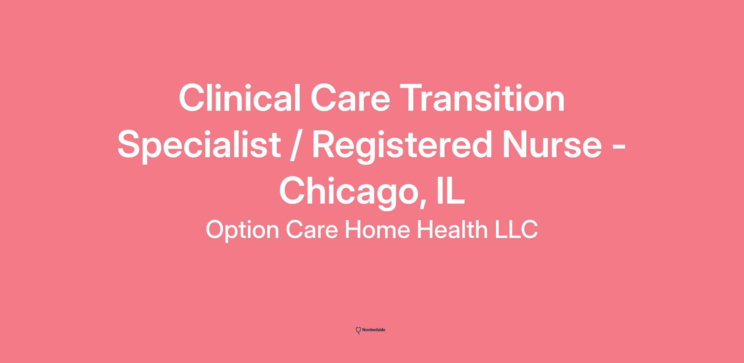 Join to apply for the Clinical Care Transition Specialist / Registered Nurse - Chicago, IL role at Option Care Home Health LLC.