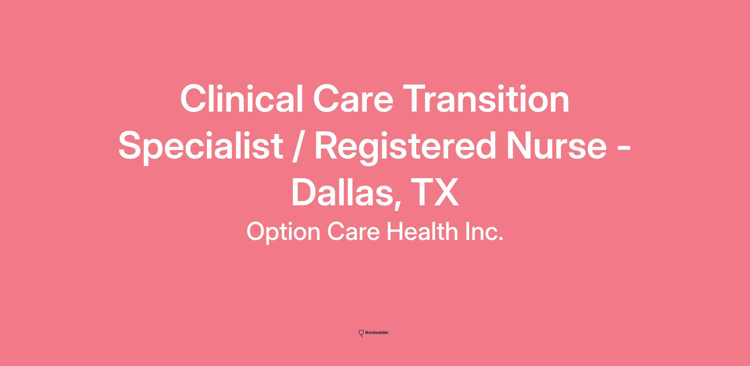 The Clinical Transition Specialist is an experienced sales professional who uses sales techniques to sell Option Care products and services to discharging patients. They are responsible for educating patients, their families and the facility staff about how the services and products will be facilitated at an alternative site. Clinical Transition Specialists ensure proper placement of patients within the Home Health Care setting by assessing patients, gathering preadmission information, collaborating with internal (intake) and external (case managers, discharge planners) partners to ensure quality of service and implementation of an effective treatment plan. Clinical Transition Specialists are also responsible for proactively building strong relationships with referral sources and partnering with Account Managers to grow referral rates and achieve sales goals.Job Description: