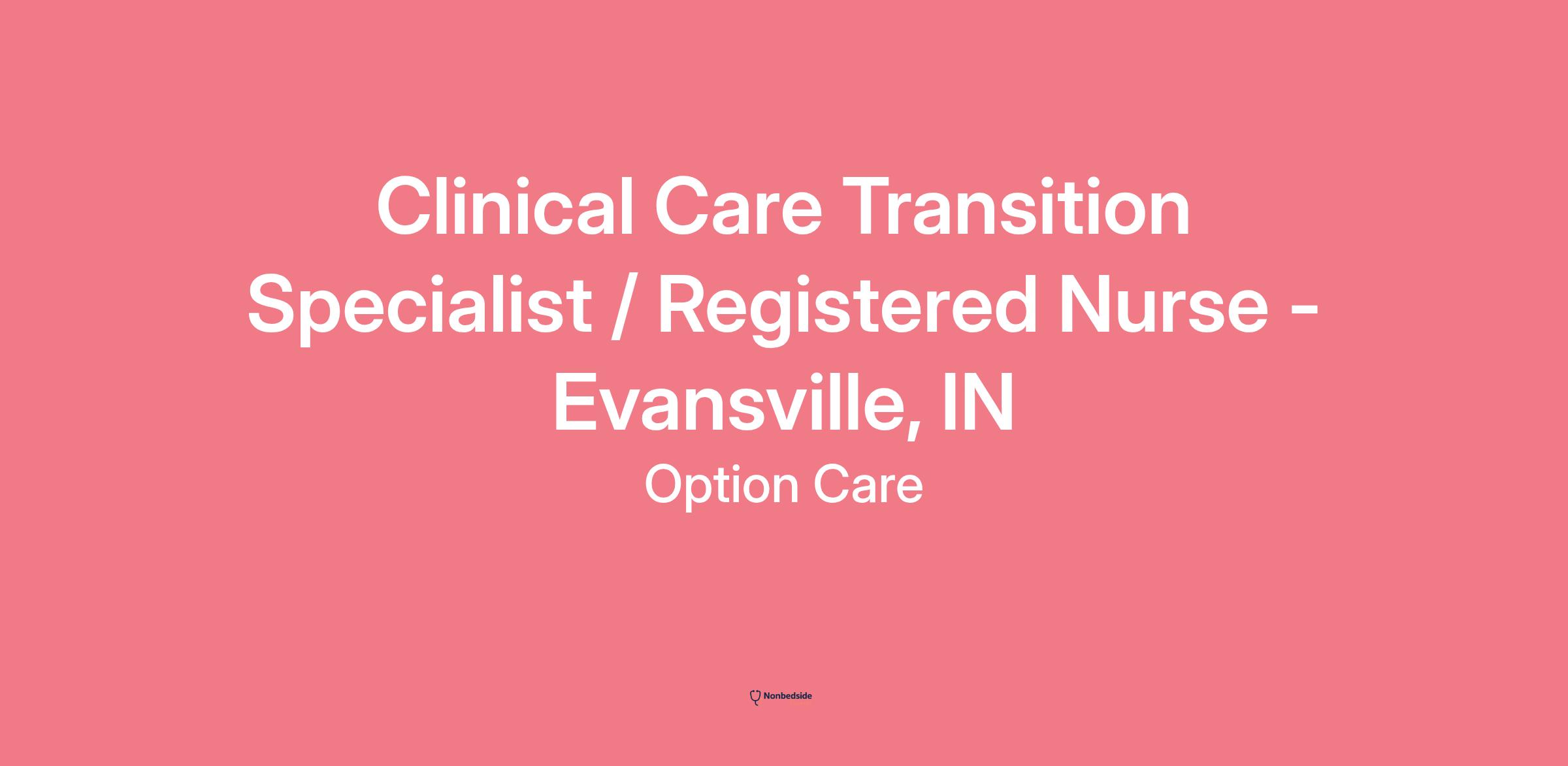 Clinical Care Transition Specialist / Registered Nurse - Evansville, IN page is loaded## Clinical Care Transition Specialist / Registered Nurse - Evansville, INlocations: Evansville, INtime type: Full timeposted on: Posted Todayjob requisition id: R33161**Extraordinary Careers. Endless Possibilities.****With the nation’s largest home infusion provider, there is no limit to the growth of your career.** Option Care Health, Inc. is the largest independent home and alternate site infusion services provider in the United States. With over 8,000 team members including 5,000 clinicians, we work compassionately to elevate standards of care for patients with acute and chronic conditions in all 50 states. Through our clinical leadership, expertise and national scale, Option Care Health is re-imagining the infusion care experience for patients, customers and team members.Join a company that is taking action to develop an inclusive, respectful, engaging and rewarding culture for all team members. At Option Care Health your voice is heard, your work is valued, and you’re empowered to grow. Cultivating a team with a variety of talents, backgrounds and perspectives makes us stronger, innovative, and more impactful. Our organization requires extraordinary people to provide extraordinary care, so we are investing in a culture that attracts, hires and retains the best and brightest talent in healthcare.**Job Description Summary:**The Clinical Transition Specialist is an experienced sales professional who uses sales techniques to sell Option Care products and services to discharging patients. They are responsible for educating patients, their families and the facility staff about how the services and products will be facilitated at an alternative site. Clinical Transition Specialists ensure proper placement of patients within the Home Health Care setting by assessing patients, gathering preadmission information, collaborating with internal (intake) and external (case managers, discharge planners) partners to ensure quality of service and implementation of an effective treatment plan. Clinical Transition Specialists are also responsible for proactively building strong relationships with referral sources and partnering with Account Managers to grow referral rates and achieve sales goals.**Job Description:** JOB RESPONSIBILITIES* Proactively maintains and grows relationships with referrals sources to increase sales and patient starts. Serves as key point of contact and representative of Option Care to provide education, assistance, and service to referral sources.* Interacts with area service providers on a daily basis to sell Option Care services that could assist in the care for discharging patients. Conducts assessment of patients selected by the hospital to ensure patient is a viable candidate for alternative site care.* Uses sales techniques to educate patients, their families and the facility staff about the services and products provided by Option Care.* Provides hands on, in person education to patients and their caregivers with the goal of timely discharge and therapy independence.* Effectively communicates with agency staff, medical team, patients and family throughout the discharge process to implement an effective treatment plan.* Responsible for collecting, reviewing and completing pre-admission information and securing related signoff.* Partners with Account Manager and Regional Sales Director to create and execute area business and growth plan.* Communicates frequently with Account Manager to discuss opportunities, assess progress, and provide feedback related to promoting the services of Option Care* Partners with Account Manager and marketing staff to deliver educational and promotional programs to patient/caregiver and referral sources.* Reviews the patient’s medical record to obtain both pertinent medical history and primary/ secondary insurance payor information and communicates this to patient registration department.* Proactively initiates care transition coordination with referral sources and internal partners to ensure seamless patient transitions to home or ATS. Participates with any data collection required for therapy start and patient tracking process. This may include facilitating the transfer of orders via phone, fax, and e-prescribing* Maintains confidentiality of patient and proprietary information and observes legal guidelines for safeguarding the confidentiality of patient and proprietary Option Care information.* Provides oversight and input to the providers regarding the patient and proper assessment and treatment process and transition to home care.* Serves as a point of contact, coordination, and communication with other providers.* Makes arrangements for any special medical supplies or appliances to be available.SUPERVISORY RESPONSIBILITIESDoes this position have supervisory NO(i.e. hiring, recommending/approving promotions and pay increases, scheduling, performance reviews, discipline, etc.)BASIC EDUCATION AND EXPERIENCE REQUIREMENTSLicensed Registered Nurse (RN) or licensed Pharmacist in the state of practice and at least 2 years of experience in the healthcare industry.BASIC QUALIFICATIONS* Experience establishing and maintaining relationships with individuals at all levels of the organization in the business community and with vendors.* Experience applying knowledge of standard practices for all services offered as well as current relevant and applicable standards (i.e. ACHC, URAC standards).* Experience providing customer service to internal and external customers, including meeting quality standards of services, and evaluation of customer satisfaction.* Basic PC skills: Able to competently use internet, email, Microsoft Word, Microsoft Excel, Microsoft PowerPoint* Experience in identifying operational issues and recommending and implementing strategies to resolve and improve processes.* Access to a reliable means of transportation which will enable the incumb