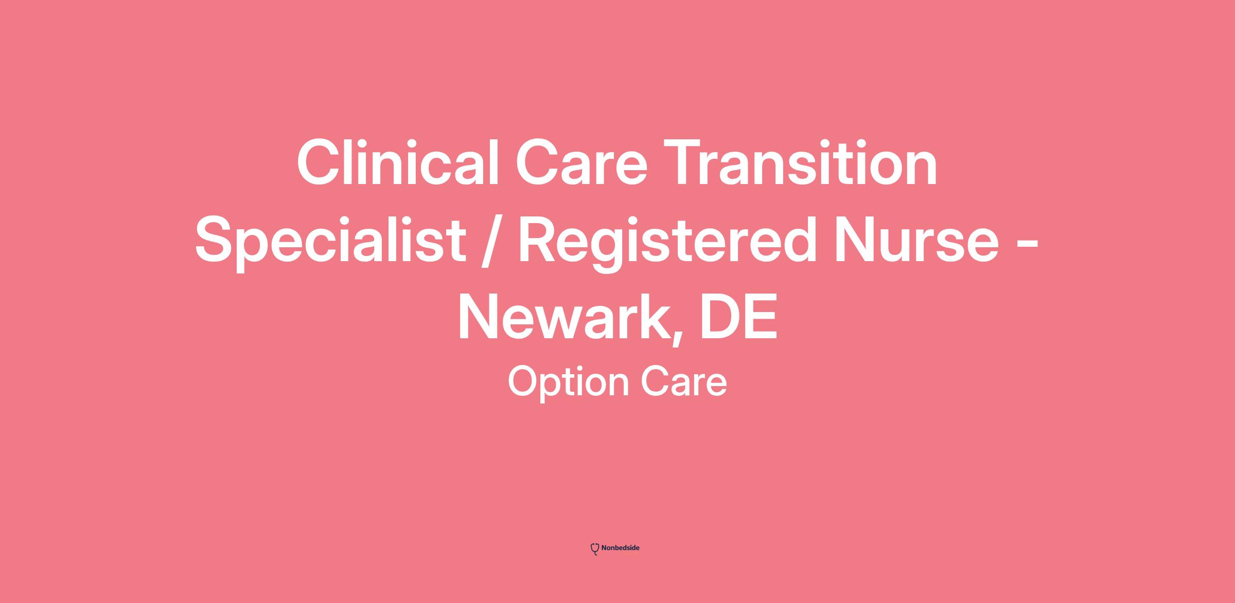 Clinical Care Transition Specialist / Registered Nurse - Newark, DE page is loaded## Clinical Care Transition Specialist / Registered Nurse - Newark, DElocations: Newark, DEtime type: Full timeposted on: Posted Todayjob requisition id: R33364**Extraordinary Careers. Endless Possibilities.****With the nation’s largest home infusion provider, there is no limit to the growth of your career.** Option Care Health, Inc. is the largest independent home and alternate site infusion services provider in the United States. With over 8,000 team members including 5,000 clinicians, we work compassionately to elevate standards of care for patients with acute and chronic conditions in all 50 states. Through our clinical leadership, expertise and national scale, Option Care Health is re-imagining the infusion care experience for patients, customers and team members.Join a company that is taking action to develop an inclusive, respectful, engaging and rewarding culture for all team members. At Option Care Health your voice is heard, your work is valued, and you’re empowered to grow. Cultivating a team with a variety of talents, backgrounds and perspectives makes us stronger, innovative, and more impactful. Our organization requires extraordinary people to provide extraordinary care, so we are investing in a culture that attracts, hires and retains the best and brightest talent in healthcare.**Job Description Summary:**The Clinical Transition Specialist is an experienced sales professional who uses sales techniques to sell Option Care products and services to discharging patients. They are responsible for educating patients, their families and the facility staff about how the services and products will be facilitated at an alternative site. Clinical Transition Specialists ensure proper placement of patients within the Home Health Care setting by assessing patients, gathering preadmission information, collaborating with internal (intake) and external (case managers, discharge planners) partners to ensure quality of service and implementation of an effective treatment plan. Clinical Transition Specialists are also responsible for proactively building strong relationships with referral sources and partnering with Account Managers to grow referral rates and achieve sales goals.**Job Description:** JOB RESPONSIBILITIES* Proactively maintains and grows relationships with referrals sources to increase sales and patient starts. Serves as key point of contact and representative of Option Care to provide education, assistance, and service to referral sources.* Interacts with area service providers on a daily basis to sell Option Care services that could assist in the care for discharging patients. Conducts assessment of patients selected by the hospital to ensure patient is a viable candidate for alternative site care.* Uses sales techniques to educate patients, their families and the facility staff about the services and products provided by Option Care.* Provides hands on, in person education to patients and their caregivers with the goal of timely discharge and therapy independence.* Effectively communicates with agency staff, medical team, patients and family throughout the discharge process to implement an effective treatment plan.* Responsible for collecting, reviewing and completing pre-admission information and securing related signoff.* Partners with Account Manager and Regional Sales Director to create and execute area business and growth plan.* Communicates frequently with Account Manager to discuss opportunities, assess progress, and provide feedback related to promoting the services of Option Care* Partners with Account Manager and marketing staff to deliver educational and promotional programs to patient/caregiver and referral sources.* Reviews the patient’s medical record to obtain both pertinent medical history and primary/ secondary insurance payor information and communicates this to patient registration department.* Proactively initiates care transition coordination with referral sources and internal partners to ensure seamless patient transitions to home or ATS. Participates with any data collection required for therapy start and patient tracking process. This may include facilitating the transfer of orders via phone, fax, and e-prescribing* Maintains confidentiality of patient and proprietary information and observes legal guidelines for safeguarding the confidentiality of patient and proprietary Option Care information.* Provides oversight and input to the providers regarding the patient and proper assessment and treatment process and transition to home care.* Serves as a point of contact, coordination, and communication with other providers.* Makes arrangements for any special medical supplies or appliances to be available.SUPERVISORY RESPONSIBILITIESDoes this position have supervisory NO(i.e. hiring, recommending/approving promotions and pay increases, scheduling, performance reviews, discipline, etc.)BASIC EDUCATION AND EXPERIENCE REQUIREMENTSLicensed Registered Nurse (RN) or licensed Pharmacist in the state of practice and at least 2 years of experience in the healthcare industry.BASIC QUALIFICATIONS* Experience establishing and maintaining relationships with individuals at all levels of the organization in the business community and with vendors.* Experience applying knowledge of standard practices for all services offered as well as current relevant and applicable standards (i.e. ACHC, URAC standards).* Experience providing customer service to internal and external customers, including meeting quality standards of services, and evaluation of customer satisfaction.* Basic PC skills: Able to competently use internet, email, Microsoft Word, Microsoft Excel, Microsoft PowerPoint* Experience in identifying operational issues and recommending and implementing strategies to resolve and improve processes.* Access to a reliable means of transportation which will enable the incumbents to trav