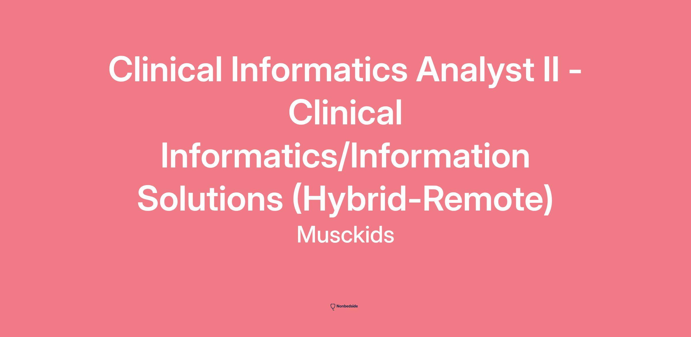 **Job Description Summary**The Clinical Informatics Analyst II reports to the Manager of Clinical Informatics. Under limited supervision, the Clinical Informatics Analyst II works collaboratively with end users and Information Solutions -IS) to design and deploy clinical information technologies that support the delivery of safe, and efficient patient care for large strategic initiative. This role performs intermediate to moderately complex level of technical and analytical work to support clinical information systems. This position serves as a mentor to junior staff members, facilitating the acquisition of informatics skills. This role collaborates with Senior Informatics leaders, other team members, and the clinical enterprise in the planning, design, development, training, implementation, and project management of Information Systems.**Entity**Medical University Hospital Authority (MUHA)**Worker Type**Employee**Worker Sub-Type**Regular**Cost Center**CC002276 SYS - IS CNIO and Informatics**Pay Rate Type**Salary**Pay Grade**Health-29**Scheduled Weekly Hours**40**Work Shift****Job Description**The Clinical Informatics Analyst II reports to the Manager of Clinical Informatics. Under limited supervision, the Clinical Informatics Analyst II works collaboratively with end users and Information Solutions -IS) to design and deploy clinical information technologies that support the delivery of safe, and efficient patient care for large strategic initiative. This role performs intermediate to moderately complex level of technical and analytical work to support clinical information systems. This position serves as a mentor to junior staff members, facilitating the acquisition of informatics skills. This role collaborates with Senior Informatics leaders, other team members, and the clinical enterprise in the planning, design, development, training, implementation, and project management of Information Systems.**Additional Job Description****Required Education/Skills/Work Experience:**Bachelor’s or Master's degree from an accredited college/university in a professional health care discipline (Registered Nursing, Radiologic Technology, Medical Technology, Respiratory or Occupational or Physical Therapy, or Pharmacy) required for hires on or after March 1, 2014; Master's degree preferred. Three (3) years of clinical experience and two (2) years of clinical informatics experience (i.e., developing, implementing and/or supporting clinical information systems) required. Epic Certification is required within 6 months of hire/transfer. Industry accepted informatics/information technology certification required within 6 months of hire/transfer. Demonstrated project management experiences, preferably in IT and healthcare. PMP preferred. Minimum of six sigma green belt preferred.Active licensure in discipline (RN, RT, ETC) by the South Carolina Board of Nursing or a compact state required. Current Basic Life Support (BLS) required, either a certification from an American Heart Association (AHA) BLS for Healthcare Providers (or AHA recognized equivalent) or an American Red Cross CPR/AED for Professional Rescuer and Healthcare Provider.**Physical Requirements:**Ability to perform job functions while standing. (Continuous) Ability to perform job functions while sitting. (Continuous) Ability to perform job functions while walking. (Continuous) Ability to climb stairs. (Infrequent) Ability to work indoors. (Continuous) Ability to work outside in temperature extremes. (Infrequent) Ability to work from elevated areas. (Frequent) Ability to work in confined/cramped spaces. (Frequent) Ability to perform job functions from kneeling positions. (Infrequent) Ability to bend at the waist. (Continuous) Ability to twist at the waist. (Frequent) Ability to squat and perform job functions. (Frequent) Ability to perform "pinching" operations. (Frequent) Ability to perform gross motor activities with fingers and hands. (Continuous) Ability to perform firm grasping with fingers and hands. (Continuous) Ability to perform fine manipulation with fingers and hands. (Continuous) Ability to reach overhead. (Frequent) Ability to perform repetitive motions with hands/wrists/elbows and shoulders. (Continuous) Ability to fully use both legs. (Continuous) Ability to use lower extremities for balance and coordination. (Frequent) Ability to reach in all directions. (Continuous) Ability to lift and carry 50 lbs. unassisted. (Infrequent) Ability to lift/lower objects 50 lbs. from/to floor from/to 36 inches unassisted. (Infrequent) Ability to lift from 36" to overhead 25 lbs. (Infrequent) Ability to exert up to 50 lbs. of force. (Frequent) Examples include: To transfer a 100 lb. patient that can not assist in the transfer requires 50 lbs. of force. For every 100 additional pounds, assistance will be required from another healthcare worker. 20 lbs. of force is needed to push a 400 lb. patient in a wheelchair on carpet. 25 lbs. of force is required to push a stretcher with a patient with one hand. Ability to maintain 20/40 vision, corrected, in one eye or with both eyes. (Continuous) Ability to see and recognize objects close at hand or at a distance. (Continuous) Ability to match or discriminate between colors. (Continuous) Ability to determine distance/relationship between objects; depth perception. (Continuous) Good peripheral vision capabilities. (Continuous) Ability to maintain hearing acuity, with correction. (Continuous) Ability to perform gross motor functions with frequent fine motor movements. (Continuous) Ability to deal effectively with stressful situations. (Continuous) Ability to work rotating shifts. (Frequent) Ability to work overtime as required. (Frequent) Ability to work in a latex safe environment. (Continuous) Ability to maintain tactile sensory functions. (Continuous) (Selected Positions) \*Ability to maintain good olfactory sensory function. (Continuous) \*(Selected Positions) \*Ability to be qualified physically for resp