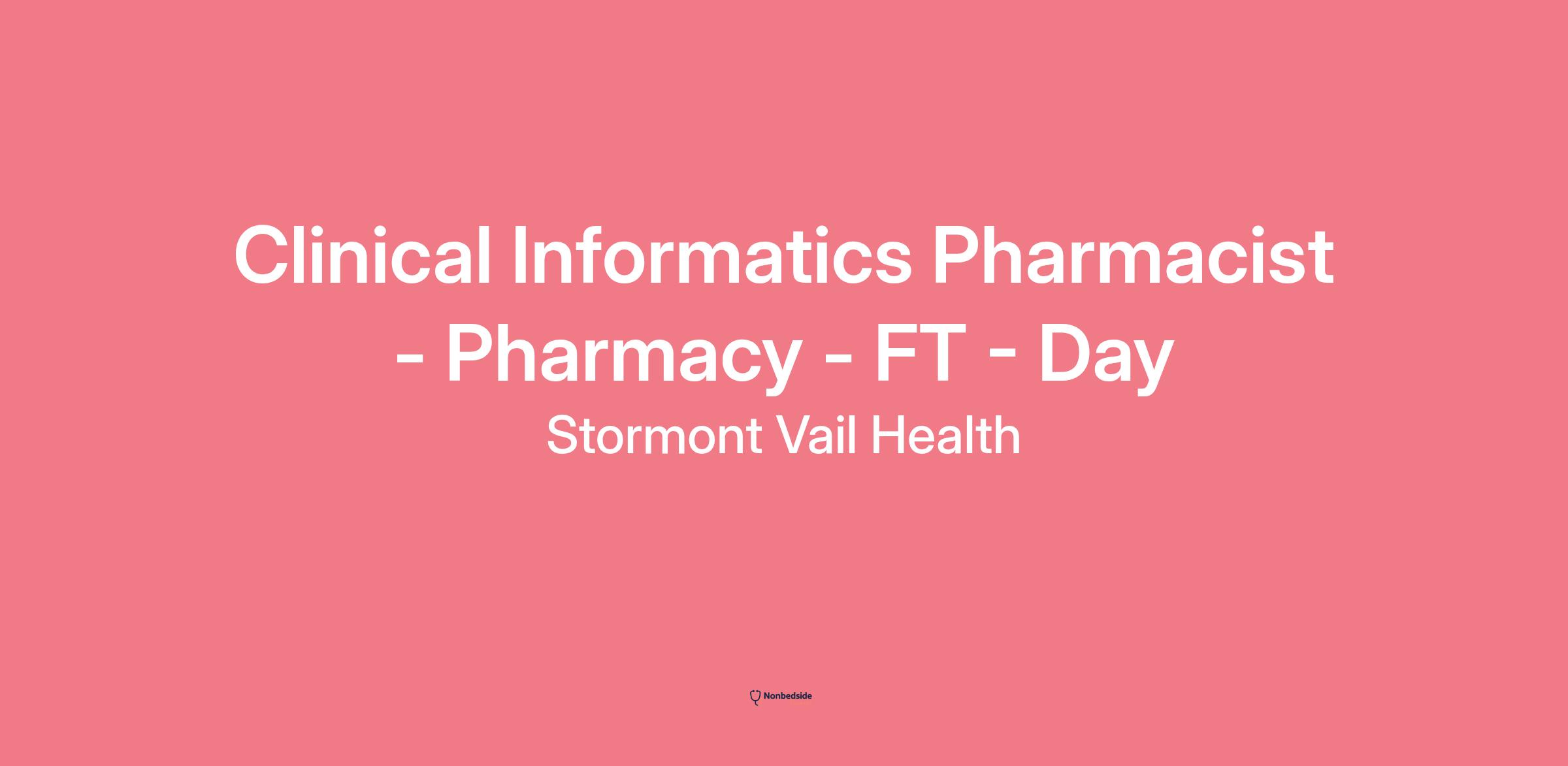 Clinical Informatics Pharmacist - Pharmacy - FT - Day page is loaded## Clinical Informatics Pharmacist - Pharmacy - FT - Daylocations: Topeka, KStime type: Full timeposted on: Posted Todayjob requisition id: req20843Position Status:Full timeShift:First Shift (Days - Less than 12 hours per shift) (United States of America)Hours per week:40Job Information Exemption Status: Exempt A Brief Overview The Clinical Informatics Pharmacist (CI Pharmacist) specializes in the use of technology to optimize all aspects of the medication use process across the healthcare system. Responsibilities include the effective design, development, implementation, and maintenance of medication related components of the electronic medical record (EMR) and clinical decision support tools. This role supports pharmacists, physicians, nurses, and other clinicians as the resource for requests related to EMR changes and additions. The CI Pharmacist collaborates with patient care, departmental leadership, Quality, Patient Safety, and Information Systems staff on the clarification, feasibility, prioritization, design, and execution of changes to the EMR. Education Qualifications* Bachelor's Degree Bachelor's of Science in Pharmacy. Required or* Doctorate PharmD RequiredExperience Qualifications* Previous clinical informatics experience. Preferred* Completion of a PGY1 pharmacy residency or 3 years of hospital pharmacy experience. PreferredSkills and Abilities* Computer skills (proficiency with Excel). (Required proficiency)* Excellent communication (verbal and written) and customer service skills. (Required proficiency)* Critical thinking, reasoning, and problem-solving skills. (Required proficiency)* Ability to function independently and as a team player in a multi-hospital system. (Required proficiency)Licenses and Certifications* Pharmacist - KBP Required within 60 days of hire. Required* Support for some vendor applications requires formal certification. For positions that primarily support Epic applications, vendor certification is required within 4 months of the last date of training for a given certification track; if certification is not achieved within this timeframe employee will voluntarily resign from this position. PreferredWhat you will do* Evaluate, build, and implement clinical informatics initiatives.* Build and maintain medication formularies.* Develop and maintain order sets according to evidence-based best practices.* Troubleshoot issues in pharmacy related systems in a timely manner.* Support clinical and operational medication related EMR needs across the continuum of care (inpatient, retail, clinics, procedure areas, etc.).* Maintain and support the EMR system.* Participates in human factor engineering before and after system upgrades and improvements.* Provides expertise about the informatics of the medication use process while working on projects and in committees.* Maintain knowledge on the EMR and clinical decision support tools to meet organizational quality and patient safety goals.* Communicates and collaborates with all members of the healthcare delivery team, leadership, and Epic teams.Required for All Jobs* Complies with all policies, standards, mandatory training and requirements of Stormont Vail Health* Performs other duties as assignedPatient Facing Options* Position is Not Patient FacingRemote Work Guidelines* Workspace is a quiet and distraction-free allowing the ability to comply with all security and privacy standards.* Stable access to electricity and a minimum of 25mb upload and internet speed.* Dedicate full attention to the job duties and communication with others during working hours.* Adhere to break and attendance schedules agreed upon with supervisor.* Abide by Stormont Vail’s Remote Worker Policy and will review and acknowledge the Remote Work Agreement annually.Remote Work Capability* HybridScope* No Supervisory Responsibility* No Budget Responsibility No Budget ResponsibilityPhysical Demands* Balancing: Occasionally 1-3 Hours* Carrying: Occasionally 1-3 Hours* Climbing (Ladders): Rarely less than 1 hour* Climbing (Stairs): Rarely less than 1 hour* Crouching: Rarely less than 1 hour* Driving (Automatic): Rarely less than 1 hour* Eye/Hand/Foot Coordination: Frequently 3-5 Hours* Feeling: Frequently 3-5 Hours* Grasping (Fine Motor): Frequently 3-5 Hours* Grasping (Gross Hand): Frequently 3-5 Hours* Handling: Frequently 3-5 Hours* Hearing: Frequently 3-5 Hours* Kneeling: Rarely less than 1 hour* Lifting: Occasionally 1-3 Hours up to 50 lbs* Pulling: Occasionally 1-3 Hours up to 50 lbs* Pushing: Occasionally 1-3 Hours up to 50 lbs* Reaching (Forward): Occasionally 1-3 Hours up to 50 lbs* Reaching (Overhead): Rarely less than 1 hour up to 50 lbs* Repetitive Motions: Frequently 3-5 Hours* Sitting: Frequently 3-5 Hours* Standing: Occasionally 1-3 Hours* Stooping: Rarely less than 1 hour* Talking: Frequently 3-5 Hours* Walking: Occasionally 1-3 HoursPhysical Demand Comments: Clarity of vision at 20 inches or less and the ability to identify and distinguish colors is essential. Working Conditions* Chemical: Rarely less than 1 hour* Needle Stick: Rarely less than 1 hour* Noise/Sounds: Rarely less than 1 hour* Risk of Exposure to Hazardous Drugs: Rarely less than 1 hourStormont Vail is an equal opportunity employer and adheres to the philosophy and practice of providing equal opportunities for all employees and prospective employees, without regard to the following classifications: race, color, ethnicity, sex, sexual orientation, gender identity and expression, religion, national origin, citizenship, age, marital status, uniformed service, disability or genetic information. This applies to all aspects of employment practices including hiring, firing, pay, benefits, promotions, lateral movements, job training, and any other terms or conditions of employment.Retaliation is prohibited against any person who files a claim of discrimination, participates in a discrimination investigatio