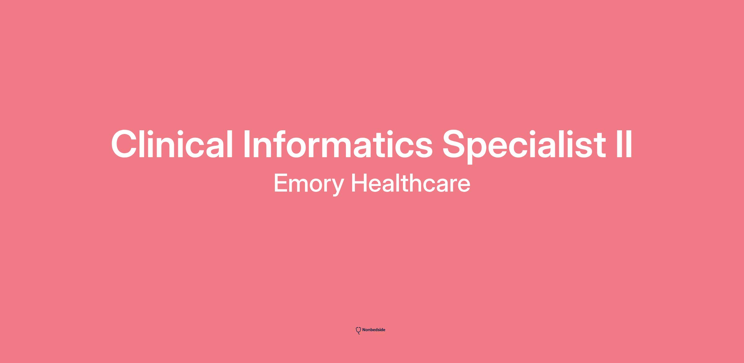 Description The Clinical Informatics Specialist II will independently champion and provide guidance for the on-going development, advancement and optimization of clinical systems and technology that impact patient care and business operations throughout the system. The Clinical Informatics Specialist II is knowledgeable about the clinical processes, relevant regulatory mandates, and principles of quality/safety improvement in their clinical area of focus. At this level, the Specialist is not only an expert in core technologies within their area of focus but also knowledgeable about workflows and applications that support core focus area. This is a customer/front facing role geared towards workflows and understanding how the system works both on the front end and behind the scenes.