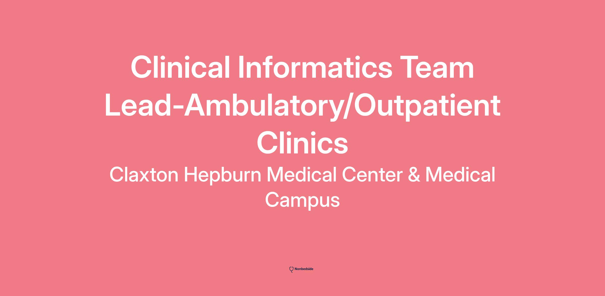Position Summary: The Clinical Informatics Team Lead – Ambulatory Clinics is responsible for leading and supporting clinical informatics efforts across outpatient settings within the health system. This role focuses on optimizing electronic health record (EHR) use, aligning clinical workflows, and ensuring system-wide standardization across primary care, specialty clinics, and other ambulatory services. Working collaboratively with providers, clinic staff, operational leaders, and IT teams, the Team Lead plays a key role in implementing best practices, improving documentation efficiency, supporting quality initiatives, and enhancing the clinician experience within the outpatient environment.