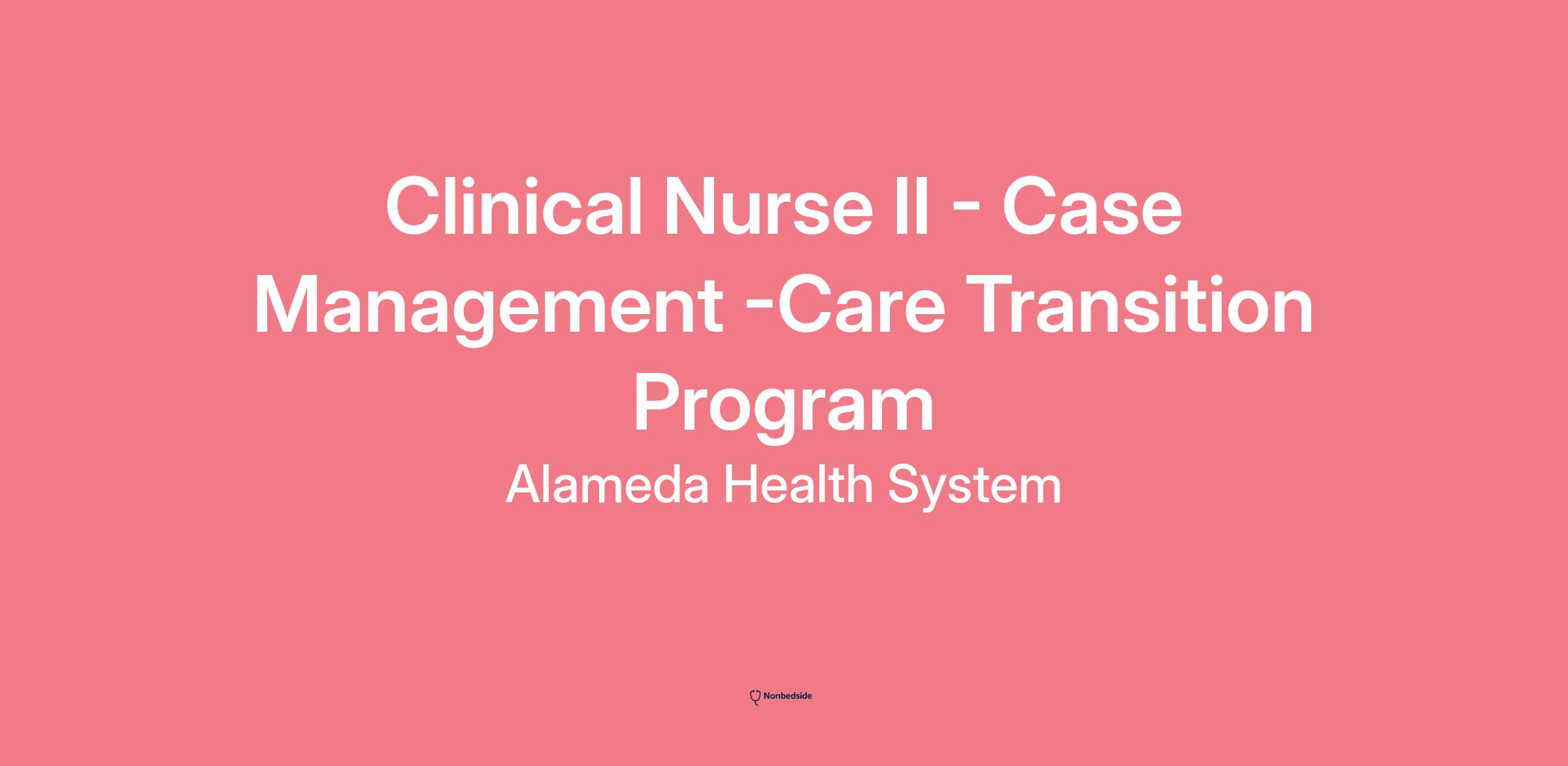 BSN or MSN Required Join Alameda Health System's Nursing Team!Strategic Direction for Our Nursing Team: Patient Focused Care - Recognize the patient or designee as the source of control and full partner in providing compassionate and coordinated care based on respect for patient's preferences, values, and needs. Enhanced Collaboration and Interdisciplinary Teamwork - Create an environment that allows the collective knowledge, resources and skills of each team member to flourish. Clinical Scholarship and Professional Development - Promote evidenced-based practice in the clinical setting and to create an environment for advanced education and enhanced clinical expertise. Innovation and a Culture of Discovery - Design and implement new and innovative processes that drive continuous performance improvement. Shared Governance and Professional Accountability - Promote an environment in which clinical staff have a voice in determining their practice, standards and quality of care, and are willing to take 100% responsibility for their practice, patient care quality and outcomesJob Summary:Responsible for providing comprehensive case management services to clients identified with complex health conditions and social challenges that are at risk for health status decline.The goals and focus of these service efforts are to provide timely delivery of intensive case management services during the transitional period beginning with hospitalization and culminating with integration back into the community setting to prevent further health deterioration and reduce the need for more costly services such as acute care hospitalization and to develop self-management skills that improve his or her long-term health status.Incumbent performs all duties and responsibilities according to the Reducing Readmission Project policies and procedures, complying with established standards of care and contract requirements specified with the Moore Foundation Grant, and in accordance with the values of the organization.Performs related duties as required.Qualifications: Education:Bachelor's Degree in Nursing or related field, Master's degree in Nursing or health related field preferred. Minimum Experience:One to three years acute care experience a plus.Varied clinical experience or experience in case management/community health a plus. Required Licenses/Certifications:Valid license to practice as a Registered Nurse in the State of California.Required Licenses/Certifications:BLS ? Basic Life Support Certification issued by the American Heart Association.Valid California Driver's License. Preferred Licenses/Certification:Public Health Nurse, Case Management, Home HealthKnowledge, Skills & Abilities: Act in an appropriate and professional manner as defined by the company's Standards of Behavior, Policy and Procedures, and Scope of Services. Role model ACMC Standards of Behavior. Proficient computer skills including Microsoft Office (Word, Outlook, Excel, PowerPoint). Current office administrative practices and procedures Correct business English, including spelling, grammar and punctuation Use independent judgment and initiative within established policies and procedures. Establish and maintain effective working relationships with a variety of individuals from various socioeconomic, ethnic and cultural backgrounds. Knowledge of wellness to illness continuum. Working knowledge of public health, community resources and case management principles.Working knowledge of state and federal medical and social benefits. Self directed work, requiring good problem-solving and sound clinical judgment is required. Works in collaboration with physicians, staff, social work and other disciplines. Professional nursing practice, attitude and mission. Communicates effectively with patients and hospital personnel in person, by phone and in writing. Broad based clinical knowledge of specialty and acute care Ability to assist clients with basic financial management skills. Ability to perform a variety of duties dealing with people, often changing from one task to another without loss of efficiency or composure. Demonstrates interest in and ability to assume leadership role. Willingness to be flexible with work schedule.Job Responsibilities:1.Interprets and explains procedures, regimens, and services to patients and families; teaches patients and family member's health care and disease prevention techniques.Participates in promoting a healthful, safe, and therapeutic environment for patients and families, set up and controls the environment essential for infection control.2.Communicates with physicians and multidisciplinary health team members to provide continuity of care, supporting and maintaining the multidisciplinary team approach to ensure effective resource utilization; documents as needed in the patient medical record.3.Monitors care provided making suggestions to achieve optimal outcomes, based on evidence base practice.Participates in outcome data monitoring and audits as needed.4.Utilizes concepts of assessment, education, health coaching and provide patient-centered services.Organizes, prioritizes and completes activities and assignments in an efficient manner.5.Utilizes daily hospital census reports to identifying current and potential clients.Assesses potential clients using the designated tools and initiates hospital-based coaching activities/interventions as appropriate and in coordination with hospital staff.6.Acts as a liaison with primary care providers for identified groups of hospitalized clients.Maintains close working relationships with identified community-based providers.Visits clients/potential clients in both hospital and community settings, including private homes.Provides own transportation to community based visits.7.Responsible for direct service provision including enrollment into CTP, care coordination and evaluation of care plan.8.Obtains signed consent form for client participation and for release of information fr