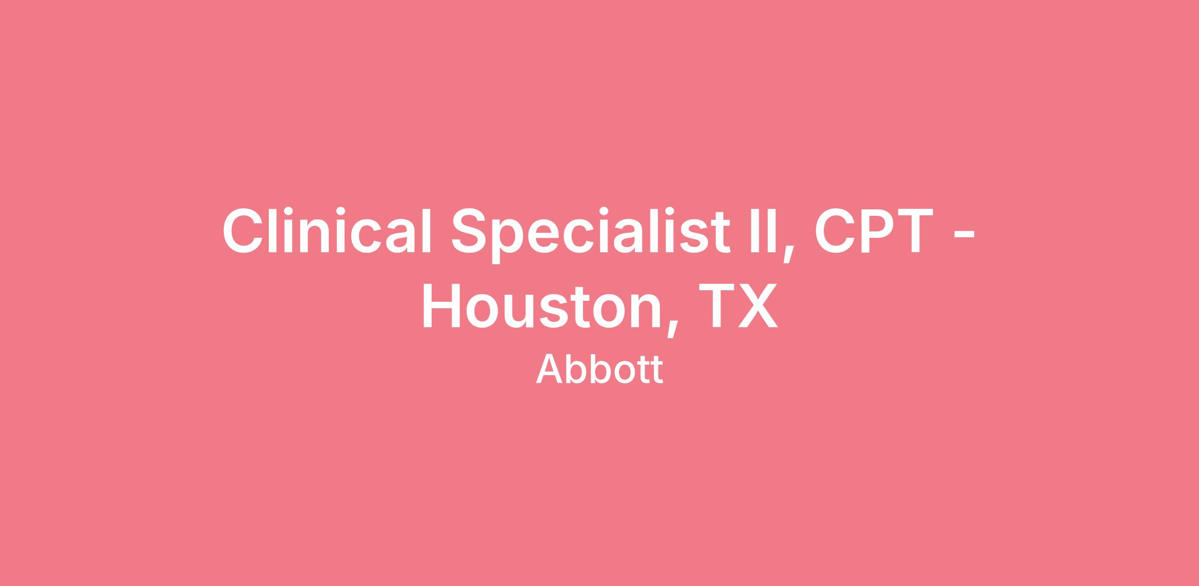 Our team is actively recruiting for a Clinical Specialist II, CPT in Houston, TX. As a member of the clinical support team, is responsible for providing technical clinical expertise and support of the sales process to colleagues, current customers and/or potential customers. Works under general direction with clinical and sales teammates to identify and capitalize on sales opportunities by creating competency, comfort, and expertise with all Abbott Chronic Pain Therapies among physicians, support staff and customers within assigned geography. Performs work that involves a high degree of independence. Exercises independent judgment in planning, organizing, and performing work. Seeks to continually improve territory efficiency.