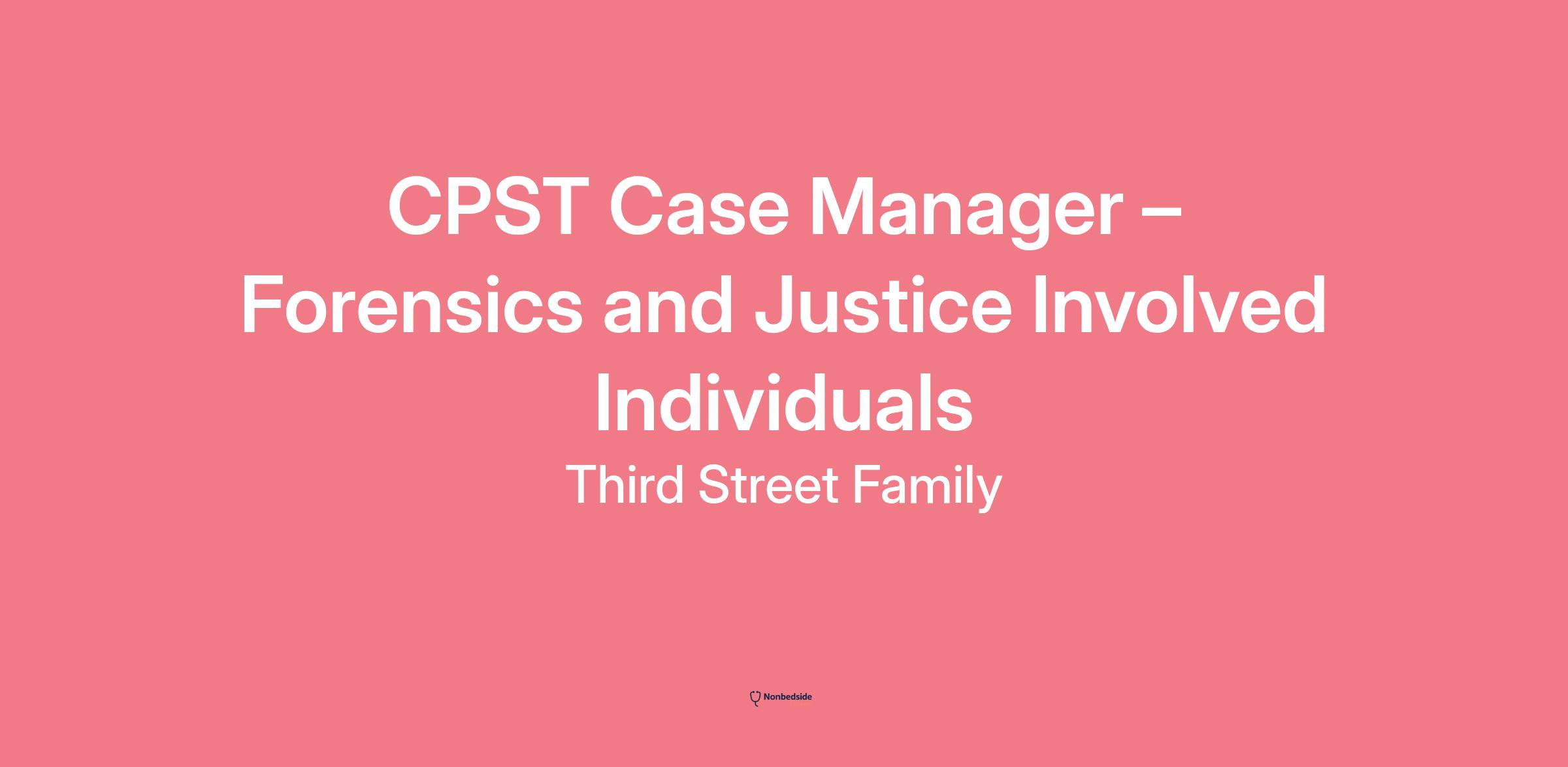 Are you a proactive problem-solver who takes pride in delivering meaningful work that makes a lasting impact? We're looking for a driven and detail-oriented professional to join our team as a CPST Case Manager . In this role, you'll play a vital part in providing care coordination, case management, behavioral health treatment intervention, and community support services to justice involved clients and clients falling within Third Street’s Forensic Monitoring Program, helping us move forward with purpose and precision. The ideal candidate values continuous learning, leads with a welcoming spirit, takes ownership of their work, and is passionate about supporting people and building stronger communities.