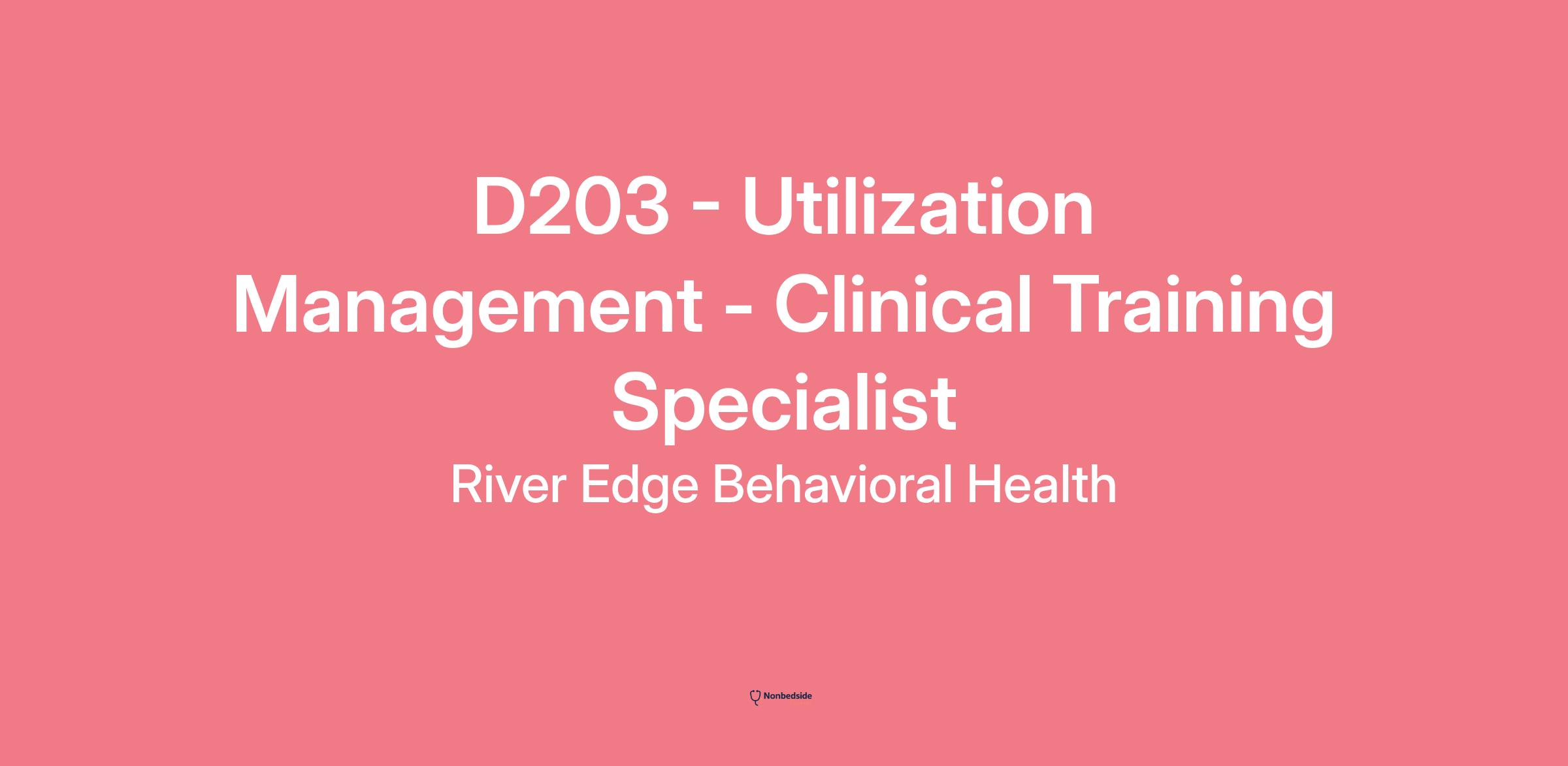 Join to apply for the D203 - Utilization Management - Clinical Training Specialist role at River Edge Behavioral Health .