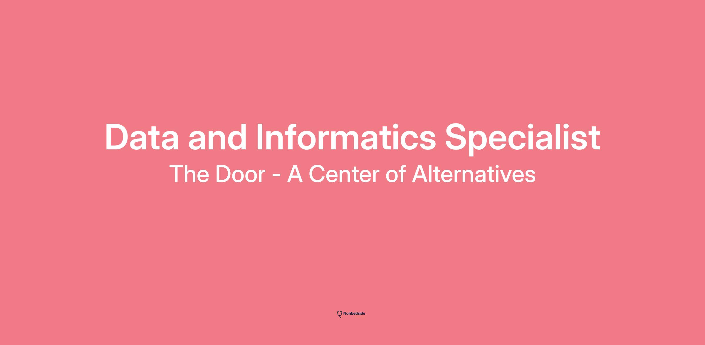 Overview The Door - A Center of Alternatives is seeking a Data and Informatics Specialist/Administrative Coordinator to support the Career and Education Services department. This role will coordinate administrative support, track participants’ progress, and assist with data collection and engagement to support young people’s academic, professional and personal growth.