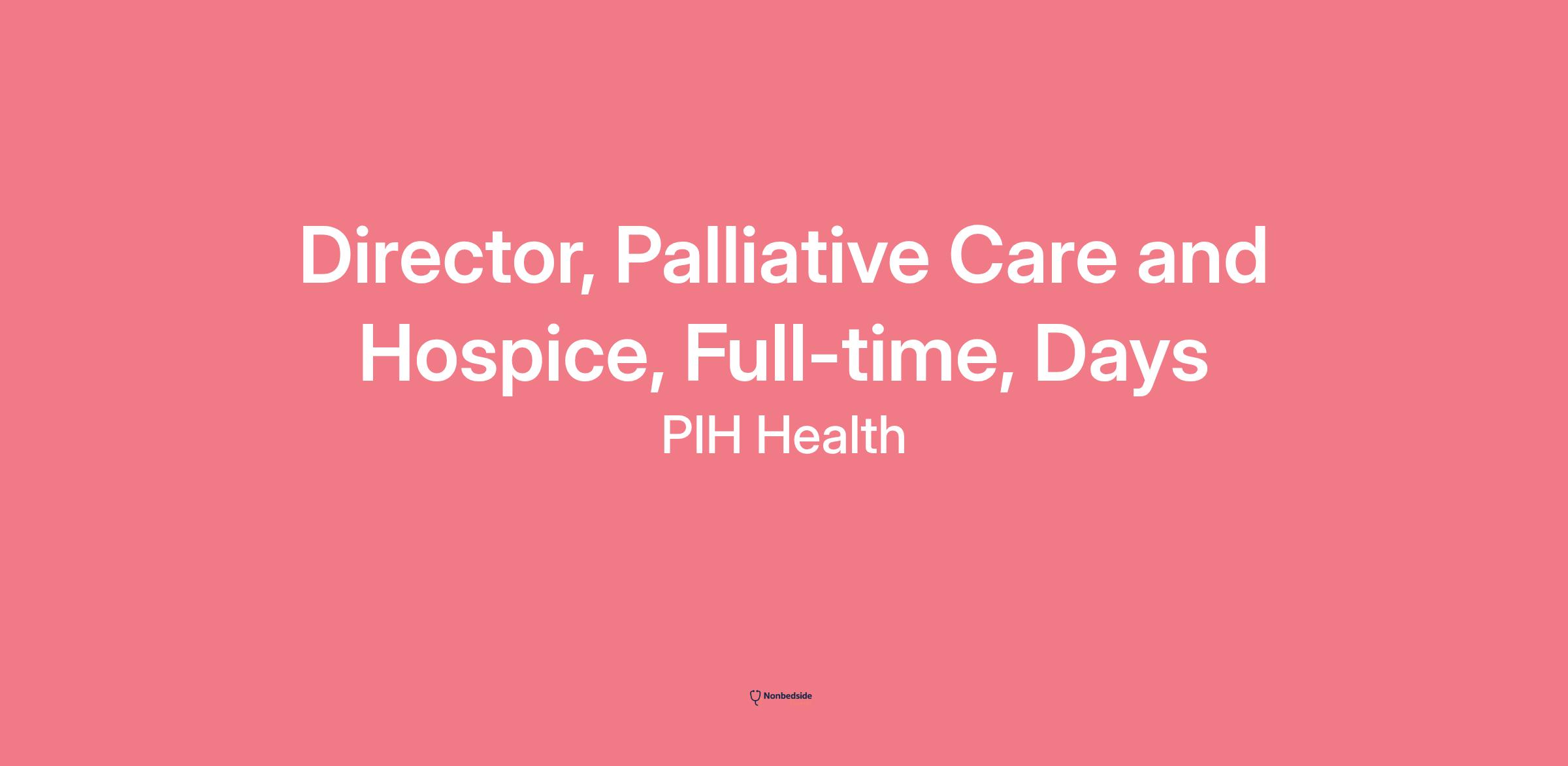 The Director of Palliative Care and Hospice has 24-hour responsibility and accountability for operations over the Palliative Care and Hospice Program. Works with Vice President, Post-Acute Care Services, Senior Director of Patient Care Services (DPCS), and staff to improve the quality of care, strengthen the financial performance, and to improve patient, physician, and employee satisfaction. Assumes responsibility for connecting Palliative and Hospice services to other PIH Health programs/services where the synergy and complementary nature of such services reach the goals and mission of PIH Health. Also accountable for the development and integration of social services programs for Post-Acute Care Services. Leads by example. Works with the team to reduce infrastructure and to promote high value performance. This is an exempt management position.